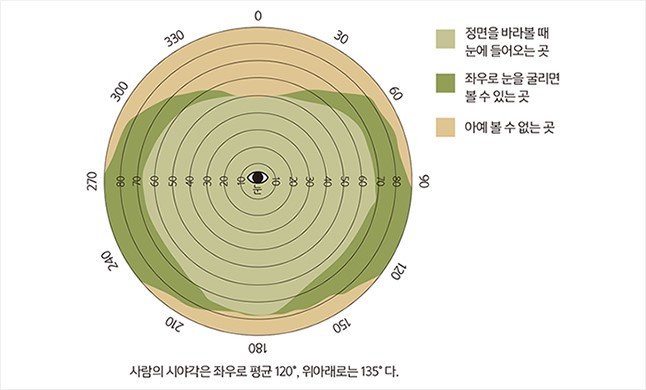 그런데 아무리 실험해도 내 시야각이 넓은지 좁은지 알 수 없었다. 왜냐하면 다른 사람들의 시야각이 어느 정도인지 나는 인지할 수 없었기 때문이었다. 결국 청소년기의 선구자적 고민의 결론은 '앞만 보이면 장땡'으로 끝을 맺었다.