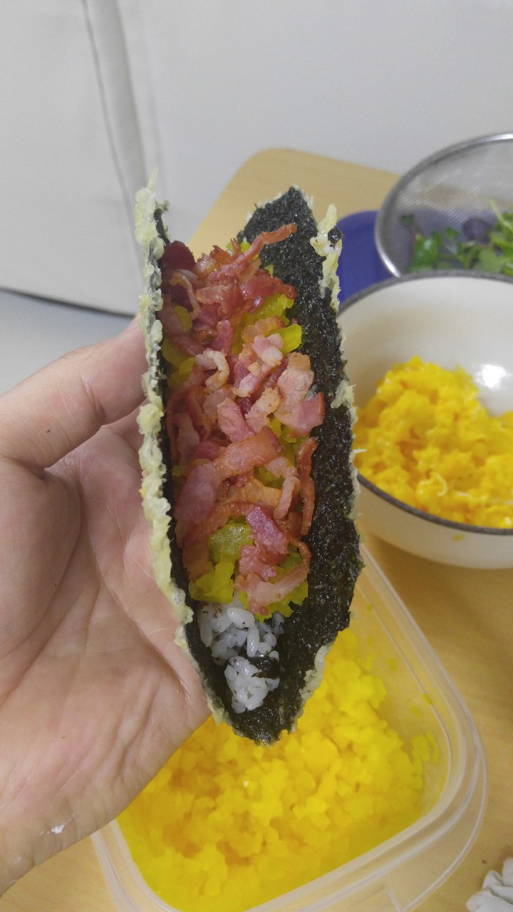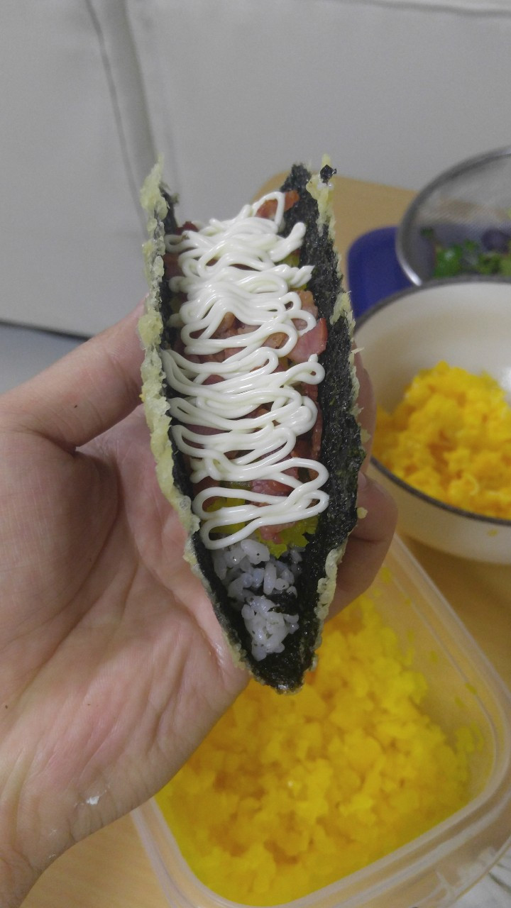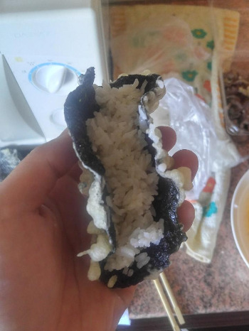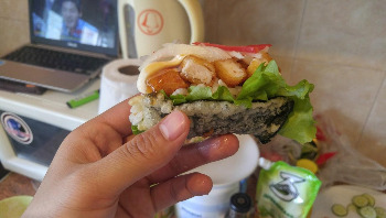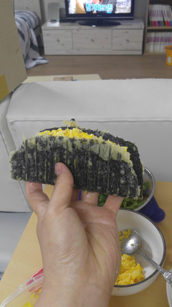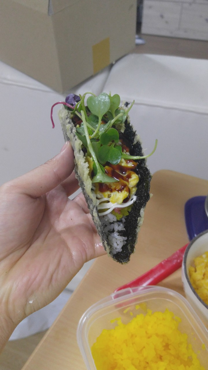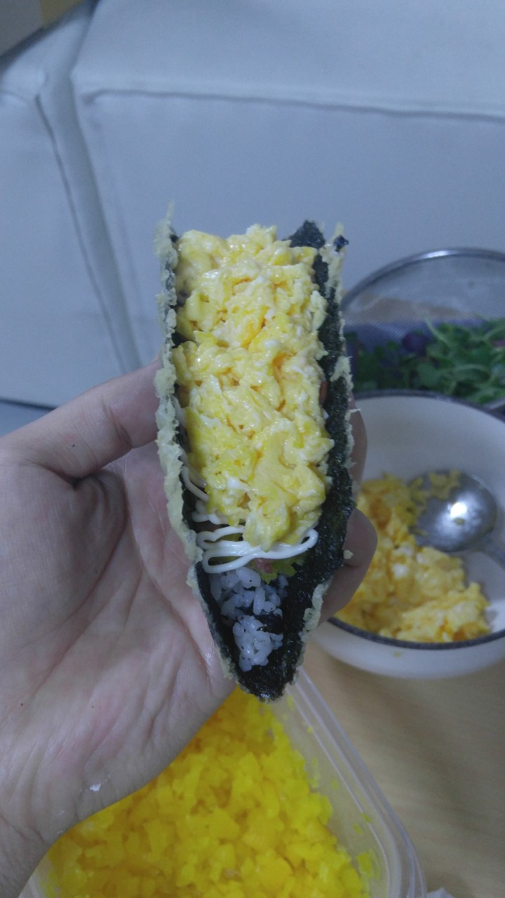 김을 그냥도 튀겨보고, 전통방식을 그대로 참고해서 튀겨보고, 수백 장의 김을 튀겨 보았다. 속재료도 오리지널 타코를 참고해서 소고기에 향신료를 넣고, 양상추를 속으로 채웠지만 다소 아쉬움을 지우지 못했다. 마음 같아서는 몇십 번이라도 더 만들어보고 싶었지만 연구를 하다 보면 하루가 훌쩍 지나가 버렸다.