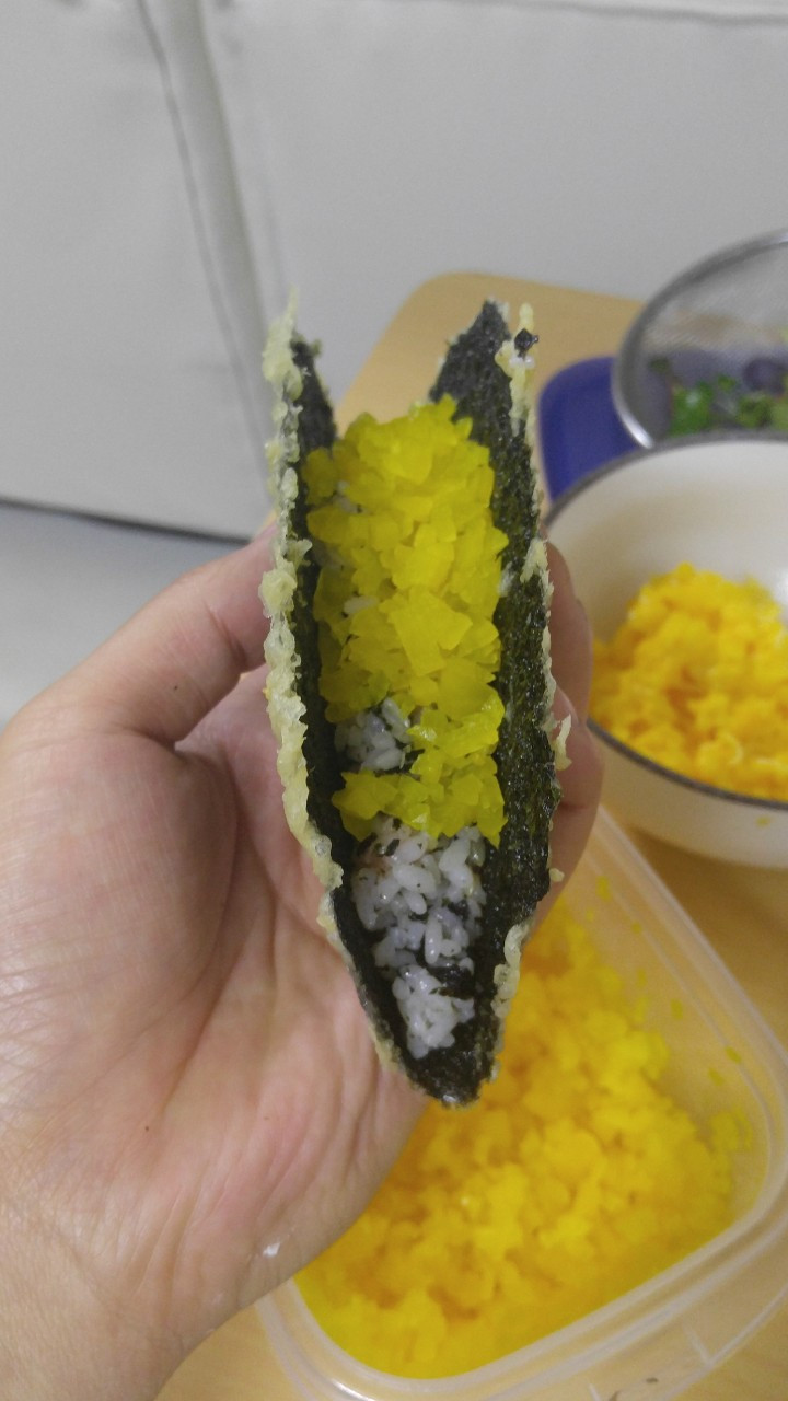 1. 알밥용 단무지는 사용이 수월하지만 씹는 식감이 부족하고, 반찬용 단무지는 식감은 좋으나 너무 커서 먹기가 힘들다. 직접 다져서 사용한다.