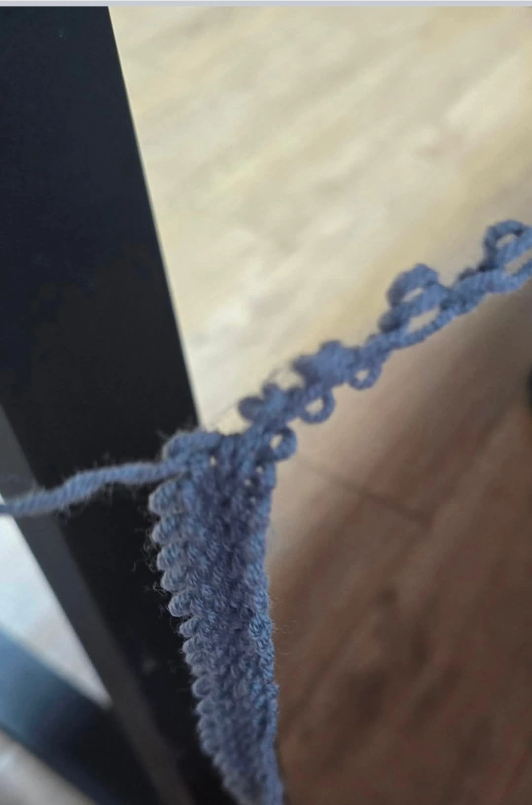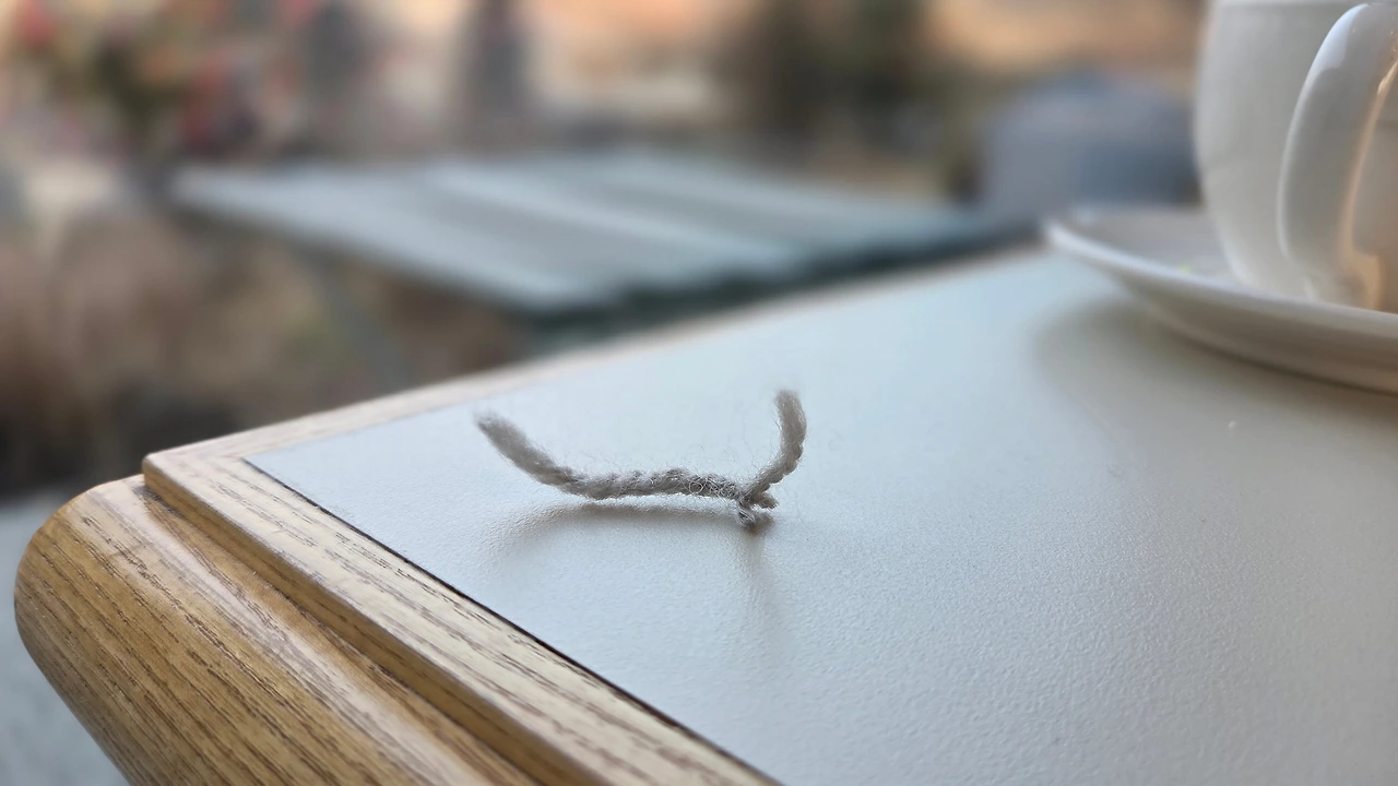 내가 뜨개질하다가 탁자에 떨어뜨린 실 조각.