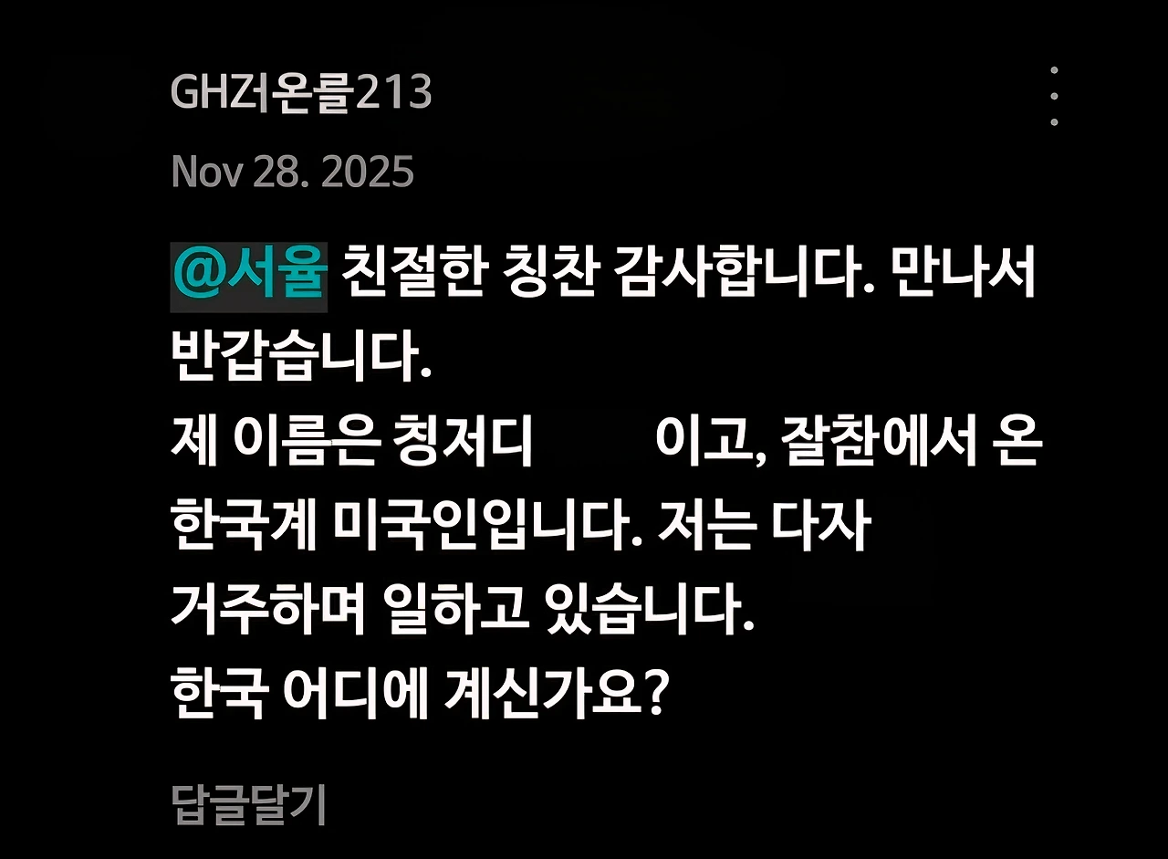 "한국 어디에 계신가요?", "그곳 날씨는 어떤가요?" 같은 질문이나, 대뜸 "제 카톡 아이디는 00입니다. 카톡으로 소통하는 친구가 되고 싶습니다" 같은 댓글을 볼 때마다 솔직히 마음이 참 불편해진다.