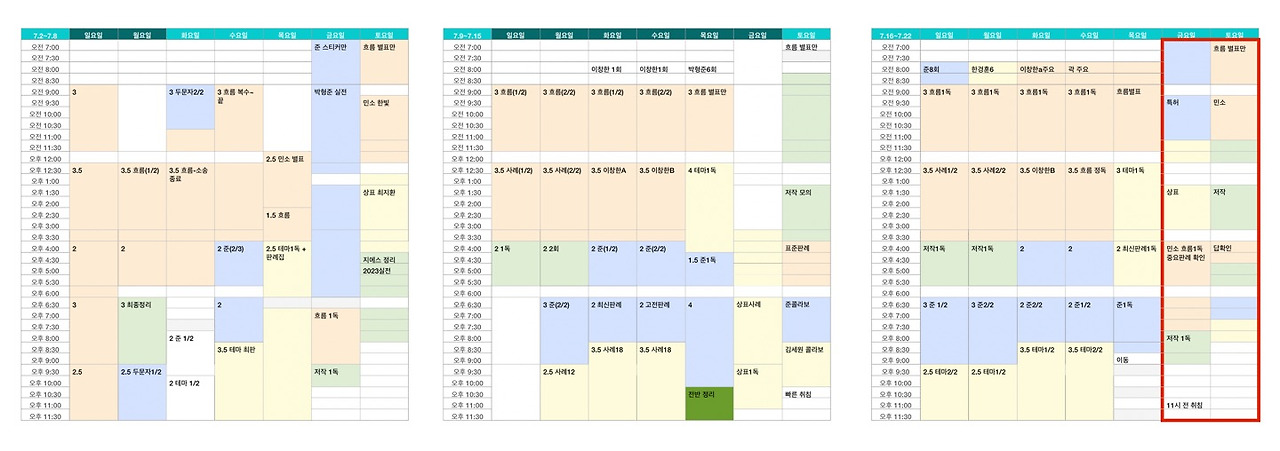 2차 시험이 있는 대망의 7월은 30분 단위로 계획 세웠습니다. 매주 금요일과 토요일은 실제 시험과 같은 시간에, 같은 과목의 주요 문제를 풀도록 했고, 시험 당일에 가장 머리에 많이 남을 수 있도록 나름의 시간표를 구성했습니다. 민사소송법은 기본서 회독(흐름)을 기본으로 하고, 사례집(이창한) 주요 문제 회독과 GS(이창한) 주요 문제 회독을 모두 했습니다. 특허법은 기본서 회독(준), GS(박형준) 주요 문제 회독, 및 최신판례자료 회독을 했습니다. 상표법은 기본서 회독(테마), 사례집 주요 문제 회독, 및 최신판례자료 회독을 했습니다. 전과목 모두 기본서 회독을 중심으로 하고, GS와 최신판례자료는 기억을 되살리는 용도로 짧게 보았습니다.