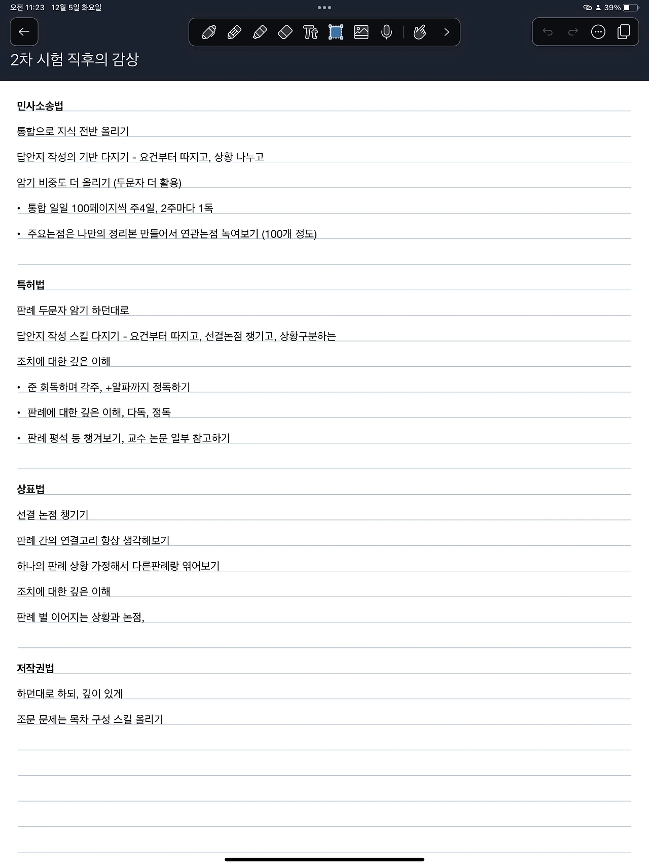 본격적인 공부를 위해 2차 종합반에서 스터디를 구성하여, 상표 및 특허를 같이 공부하기 시작했습니다. 공부할 판례들을 정하여 분석하고, 식당으로 가는 길에 외워, 식후 산책하며 검토하는 식으로 스터디를 했습니다. 이때 두문자를 많이 따 두었던 것이 기득때까지 도움이 되었습니다. 민소 사례강의는 실강을 들었으나, 절반은 온라인으로 제공되어, 시간상 온라인 강의 부분은 듣지 않았습니다. 강의를 듣고있는 시간은 공부효율이 좋지 않아 과감히 포기했습니다. 대신, 상위권의 친구를 사귀어 그 친구의 민소 복습루틴을 따라갔습니다.