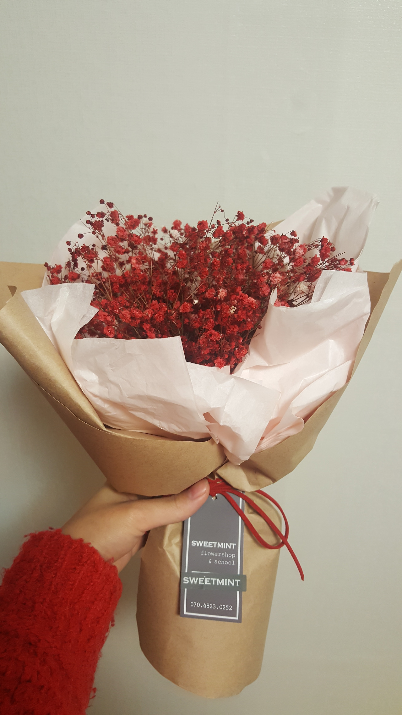 기념일도 아닌데 직접 적은 편지와 함께 말린 안개꽃 한 다발을 불쑥 내밀었다. 표지만 보고 골랐다는 카드는 다섯 장으로 엮인 작은 책 형식이었는데, 생각보다 많은 내용을 적어야 함에 당황해하다 결국 두 장은 채우지 못했다는 말에 참지 못한 웃음이 터져 나왔다. 종종 나 스스로에게 주는 선물을 해오면서도 여태까지 한 번도 꽃을 선물한 적은 없었다. 보기에는 좋지만 관리하기 힘들다는 이유 때문이다. 그런데 뜻밖의 선물에 기분이 좋아져 내 얼굴도 꽃처럼 활짝 피어났다. 붉고 작은 꽃들이 알알이 예쁘게 피어있는 상태로 잘 말린 꽃다발은, 시들어 버릴 일이 없어 여전히 내 일상에 작은 활력을 불어넣어 준다.