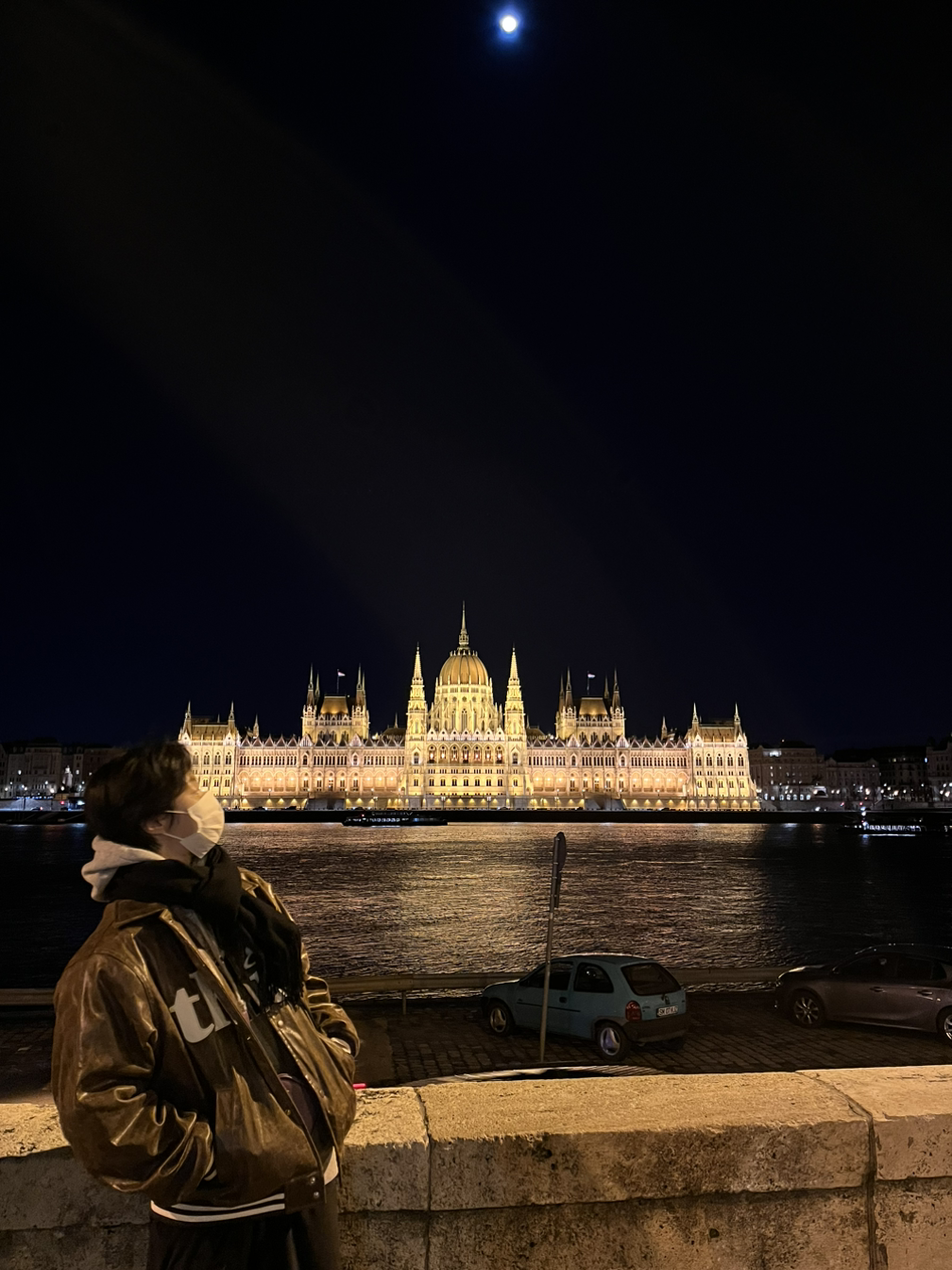 버스에서 내려 더 가까이서 본 헝가리 국회의사당은 너무 아름다웠다. 절제되어 있는 건축형태를 비추고 있는 따듯한 조명들. 대칭을 이루고 있어 세련된 웅장함을 뿜어냈다. 추운 것도 잊고 친구와 감탄을 아끼지 않으며 사진을 찍었다. 사실 도착하자마자 여행할 때 마스크 착용 안 해도 된다는 가이드님의 말씀을 들었지만 12시간 동안 기내에서 잔 기름둥둥인 나의 몰골이 부끄러워 마스크를 착용하고 있었다. 사진을 남기기 위해 마스크를 벗어야 했는데 와..! 생각보다 너무 부끄러웠다. 친구도 예상치 못한 마스크와의 작별이 익숙하지 않은 듯 머쓱하게 웃었다. 하지만 이런 중요한 순간은 남겨야 하지 않겠는가! 자신 없는 내 얼굴이 중요한 게 아니라 저 국회의사당을 보라고! 너무 아름답게 빛나잖아. 참고로 전기세가 너무 많이 올라서 조명을 다 틀지 않고 아끼고 있는 거라는데 다 틀면 대체 얼마나 더 빛나는 걸까? 지금도 이렇게 아름다운데..!
