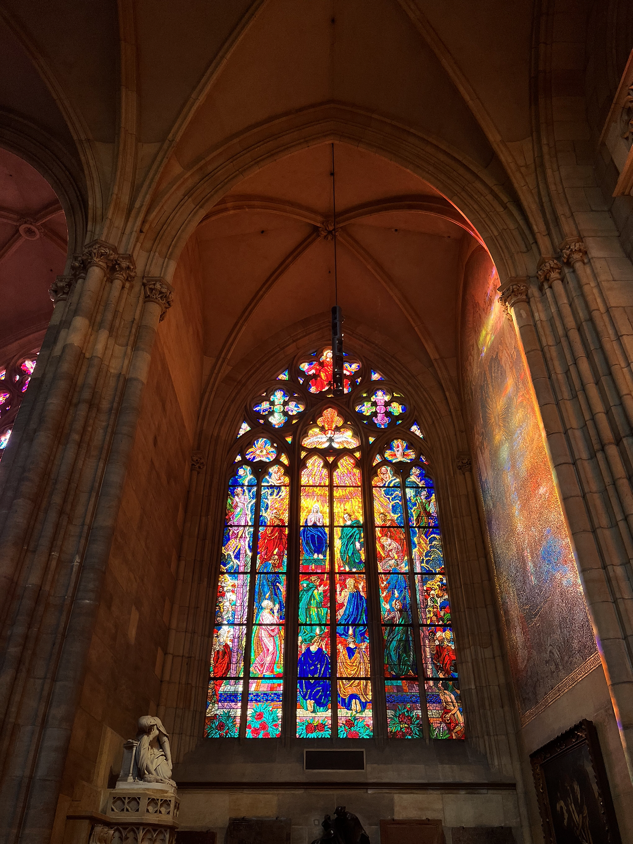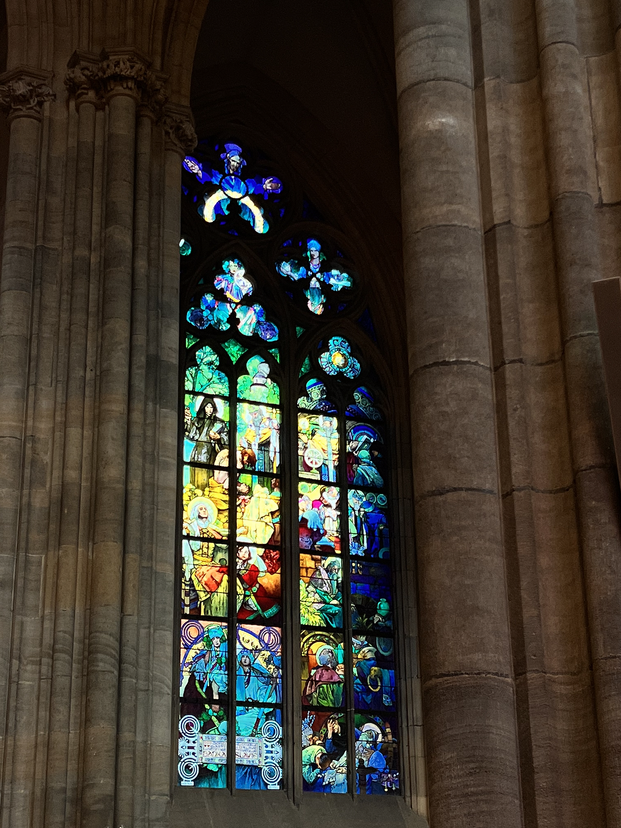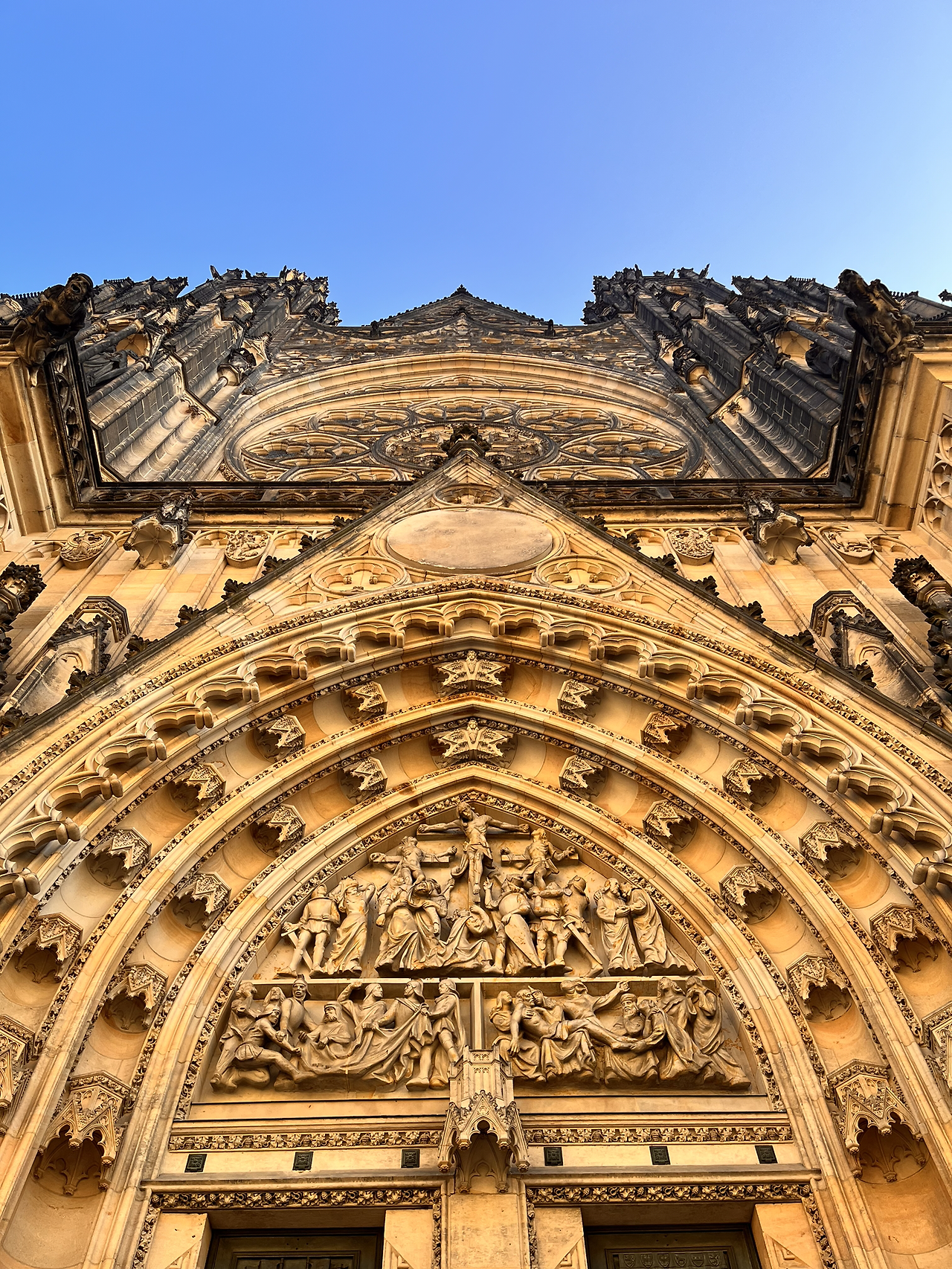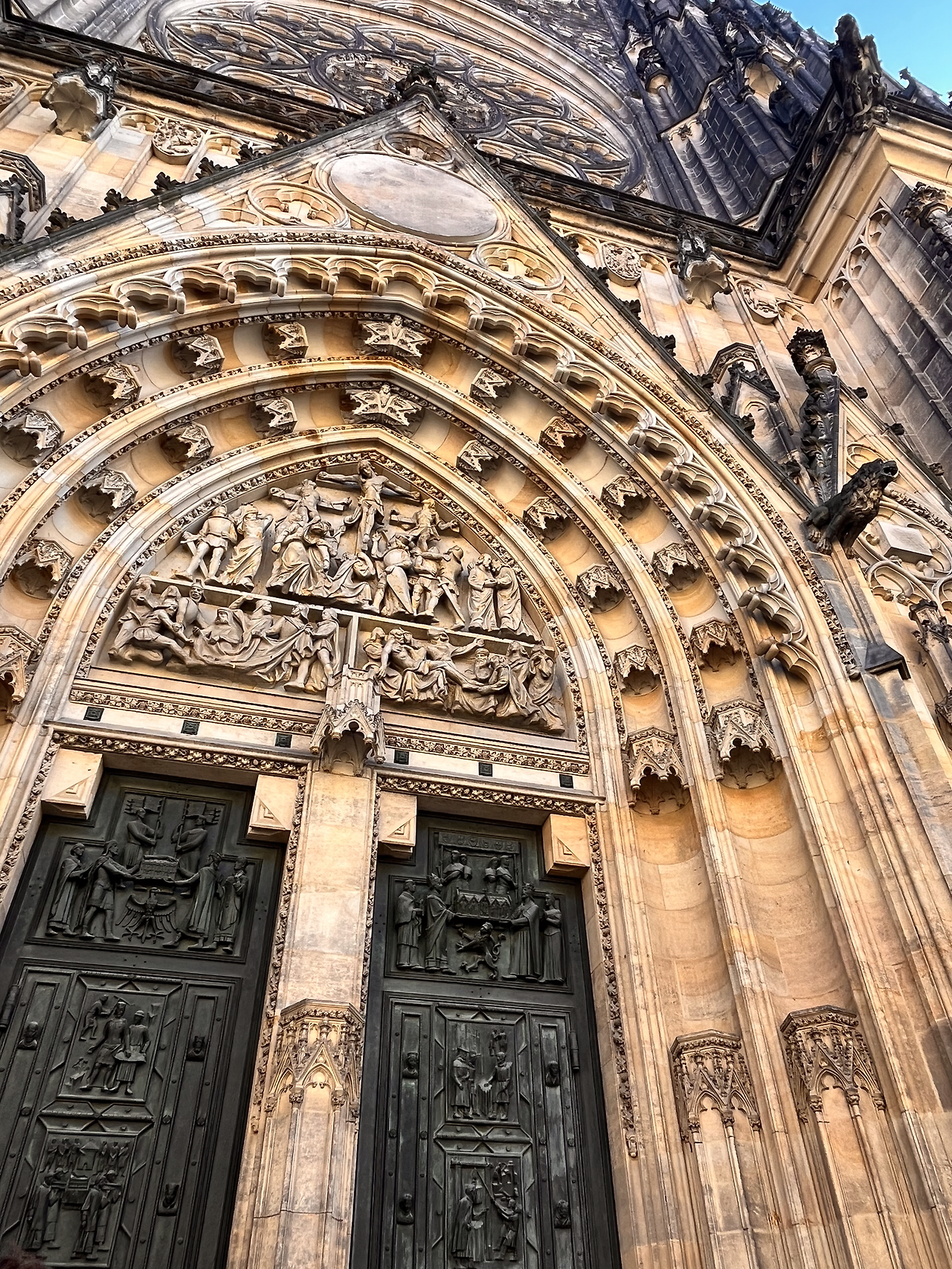 처음으로 간 곳은 성 비투스 성당. 사진으로도 느껴지지만 실제로 보면 건물이 내 머리 위로 쏟아져내리는 것 같다. 견고함과 위엄이 내 어깨를 짓누르는 기분이 들었다. 압박감이 들 정도로 멋있는 건축물이다. 이 성당이 완공되기까지 600년이 걸렸다. 문에는 600년 동안 어떤 역사가 흘렀는지 조각으로 기록되어 있다. 조각되어 있으니 진짜 600년이라는 시간이 실감이 났다. 이 성당을 짓다가 사람이 죽고 그 후세가 또 그 후세들이 지었다니.. 위엄이 안 느껴질 수가 없다. 감동적인 성당의 외관을 관람 한 뒤 실내로 들어섰다.
