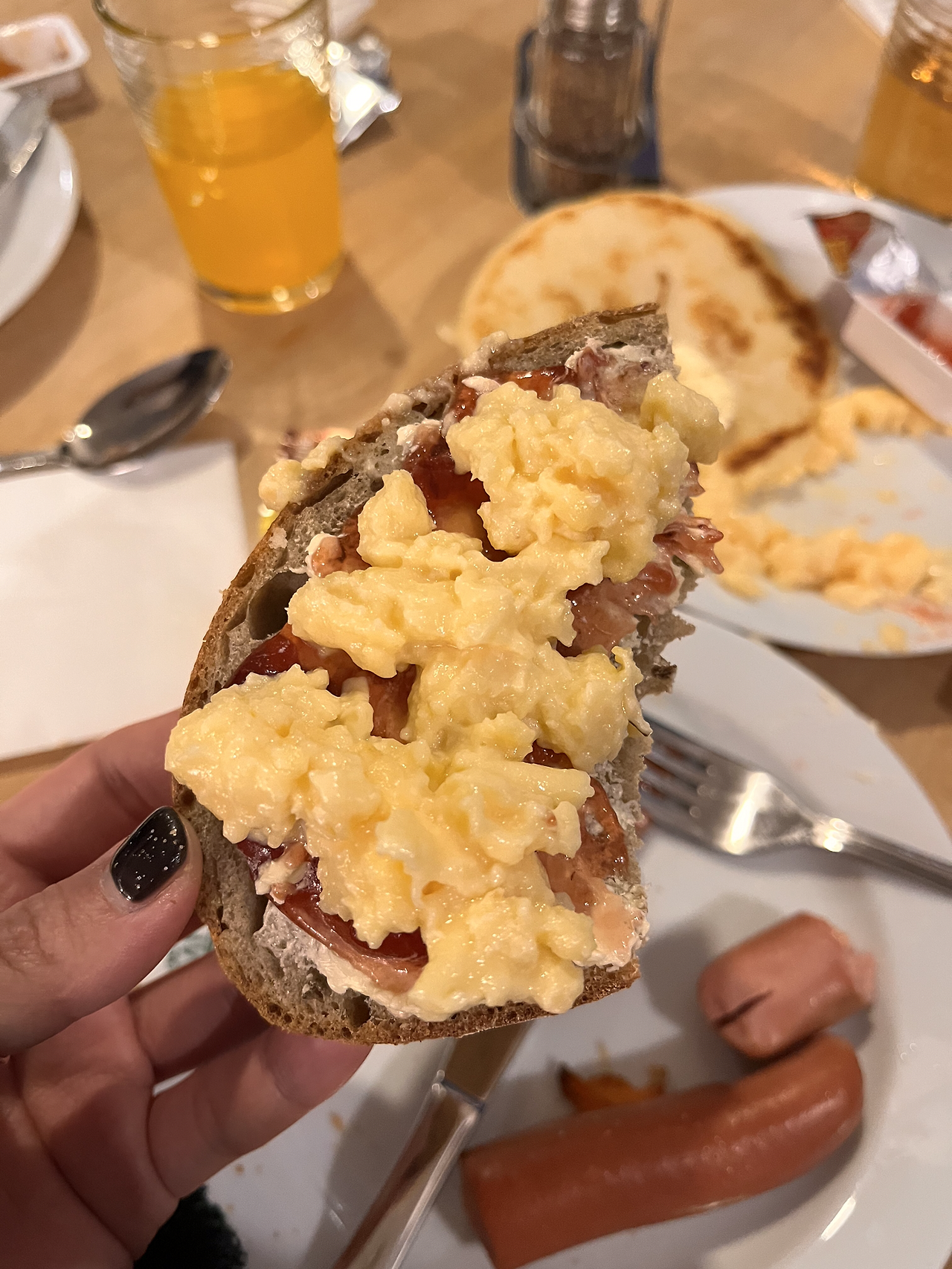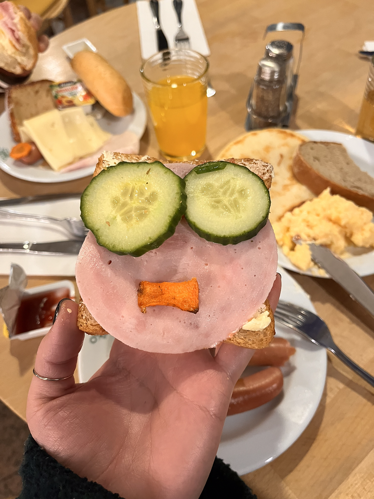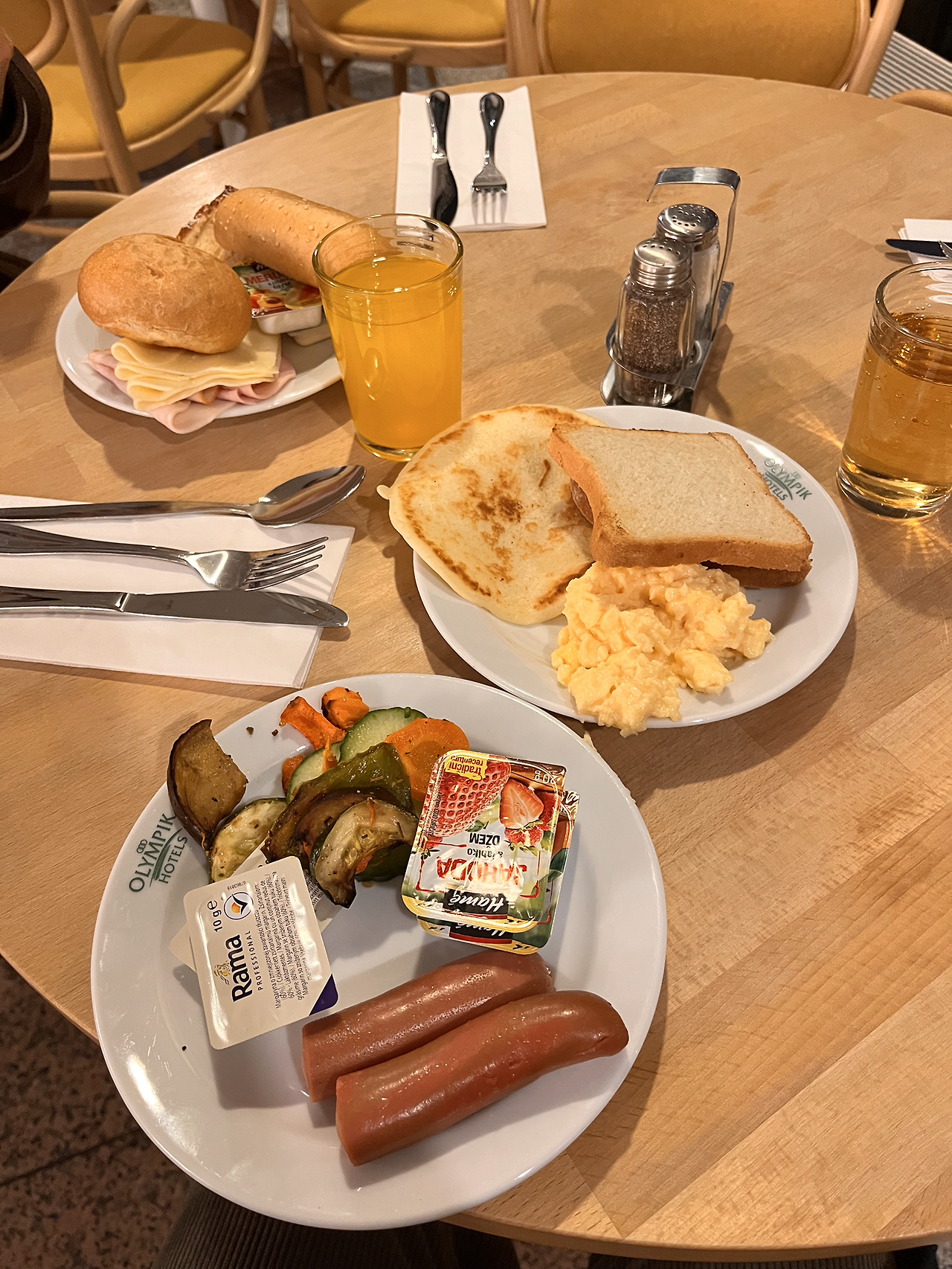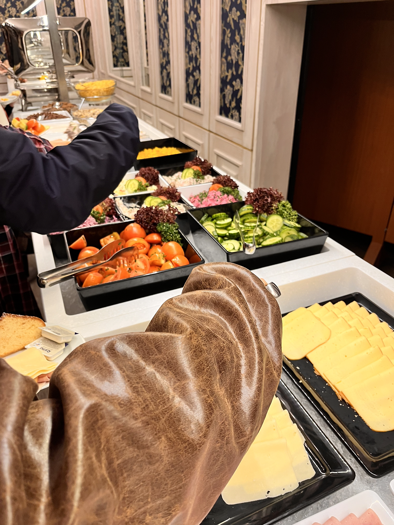 최악의 호텔(호텔이라고 불러도 될지…하하하.)에서 눈을 뜬 친구와 나. 찝찝한 카펫을 맨발로 지르밟으며 짐을 챙기고 준비했다. 오늘은 왠지 모르게 일찍 일어나서 이른 시간이라 조식 먹으러 내려왔을 때 사람이 별로 없었다. 조식 먹고 있는 사람들 80프로가 한국인이었다. 역시 빨리빨리 민족. 이렇게 티가 나는구나. 숙소가 별로라서 조식은 기대 안 했는데 나쁘지 않았다. 늘 똑같은 메뉴가 있었지만 야채 종류가 더 많았다. 햄 종류와 빵 종류도 여러 가지였다. 선택할 수 있는 종류가 많았다. 역시 기대를 안 하면 만족하게 되는 마법이란.. 숙박할 수 있는 객실 수가 많아서 그런지 많이 준비해 놓은 느낌이다. 좋다. 조식을 한가득 담아왔다. 많아 보이지만 우린 다 먹을 수 있다. 객실과는 사뭇 다른 분위기의 조식에 우리는 조금 마음이 풀렸다.