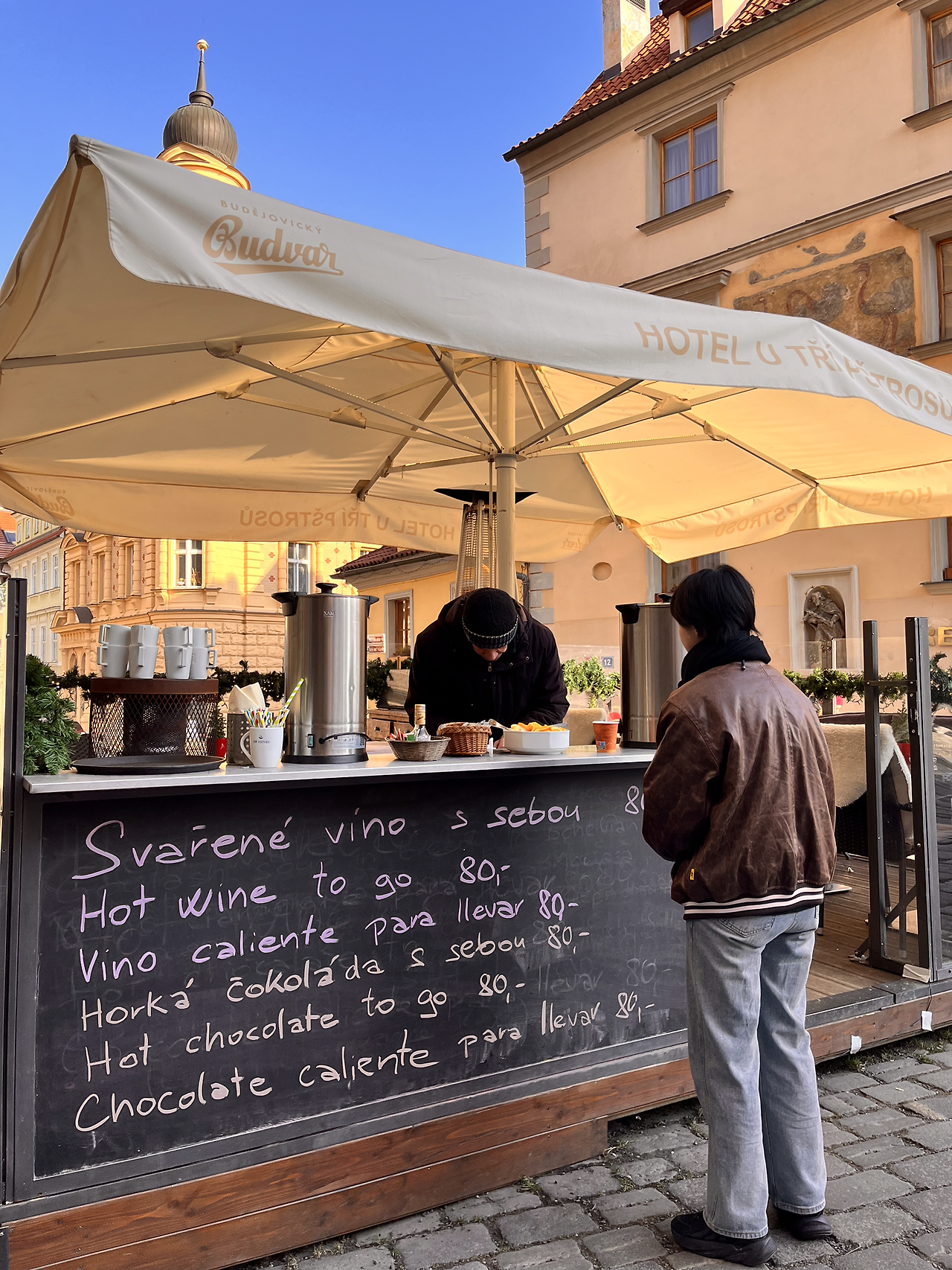 행복한 자유시간이 끝나고 모이기로 한 장소로 향했다. 카를교 다리에서 만나기로 했다. 어제도 봤던 곳이지만 밤과 낮 분위기가 많이 달라서 한번 더 봐야 한다고 가이드님이 설명해 주셨다. 일찍 도착해 다른 팀을 기다리고 있을 때 카를교 다리 쪽 입구 쪽에서 핫와인을 팔고 있는 귀여운 포차(?)가 눈에 들어왔다. 난 별로 당기지 않았지만 친구는 한번 먹어보자며 나에게 돈을 줬다. 왜 친구가 먹는데 나에게 돈을 주고 주문을 했는지 다시 생각해 보니 웃기지만 그때는 아무 생각 없이 자연스럽게 판매대로 향했다.