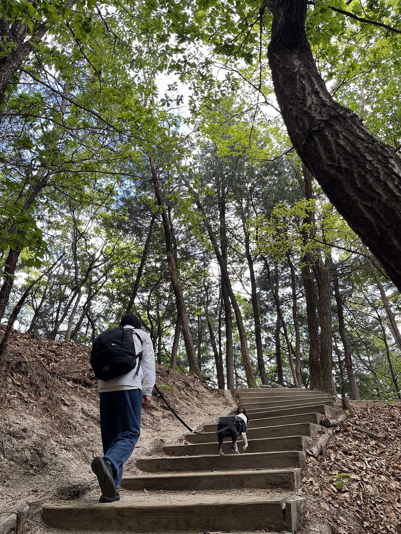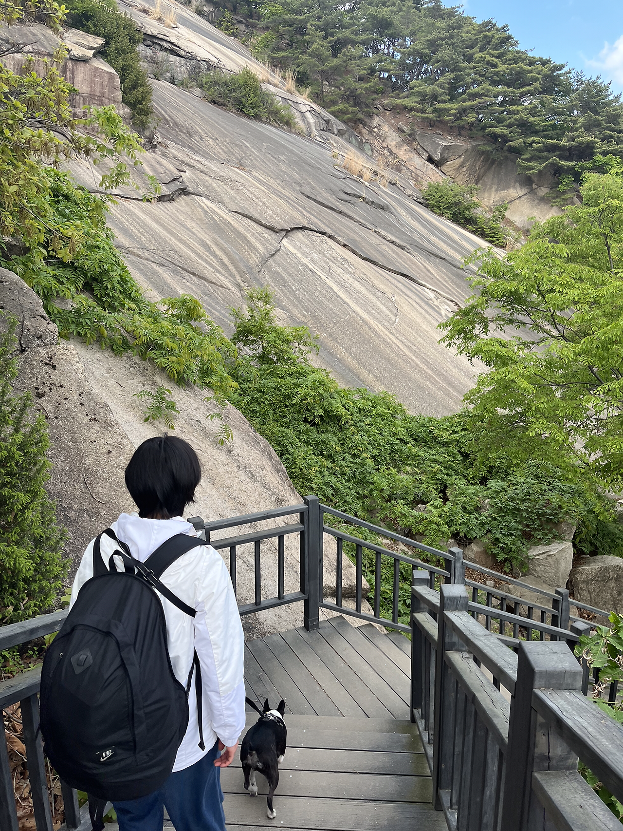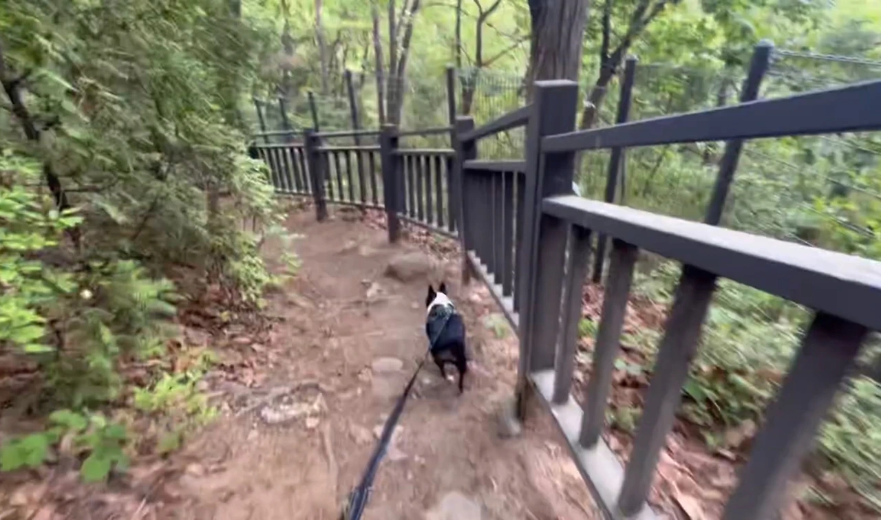 정상 같은 곳을 지나 또 내려가고 올라가고를 반복했다. 갑자기 나의 도가니가 아파오기 시작했다. 올라갈 때는 괜찮았는데 내려갈 때 너무 아팠다. 끝이 보일 기미가 보이지 않았다. 친구는 반복되는 여정을 살짝 질려하기 시작했다. 마치 한라산 하산길과 같이 똑같이 생긴 끝 없는 계단을 내려오는 기분을 또다시 느꼈다. 다온이는 우리의 걸음을 맞춰주었다. 먼저 올라가서 우리를 기다려줬다. (물론 줄은 계속 잡고 있었다.) 다온이도 반복되는 길에 살짝 멈칫 해 했다. 한참을 반복되는 계단을 쳐다보더니 다시 걷기 시작했다. 그런 다온이의 모습을 보고 ‘혹시 다온이도 지겨운 걸까..?’ 내 멋대로 생각하게 됐다.