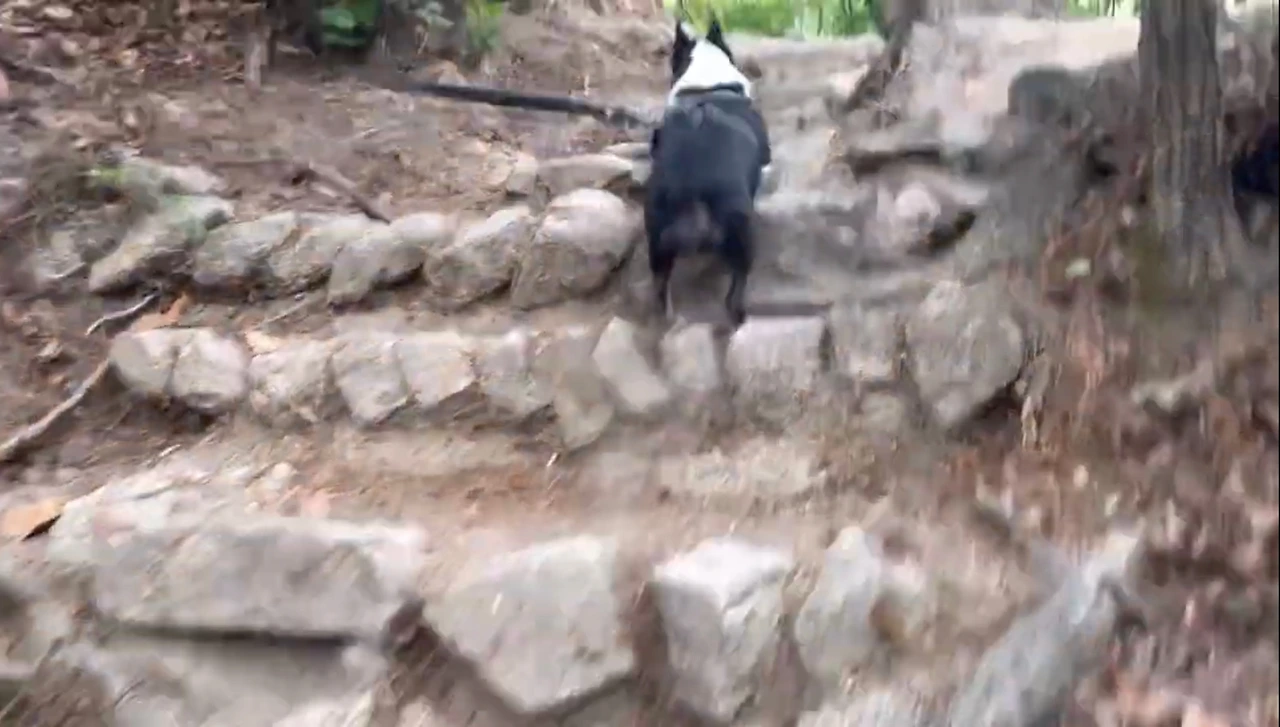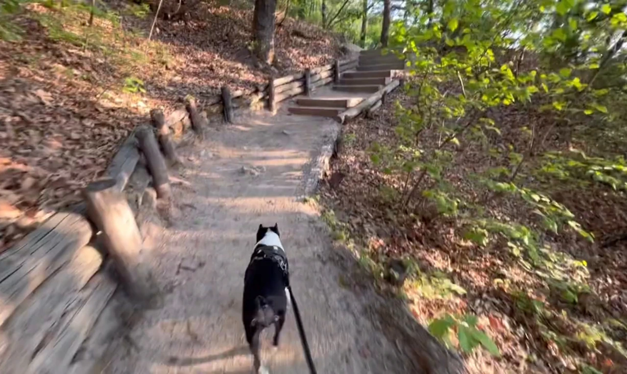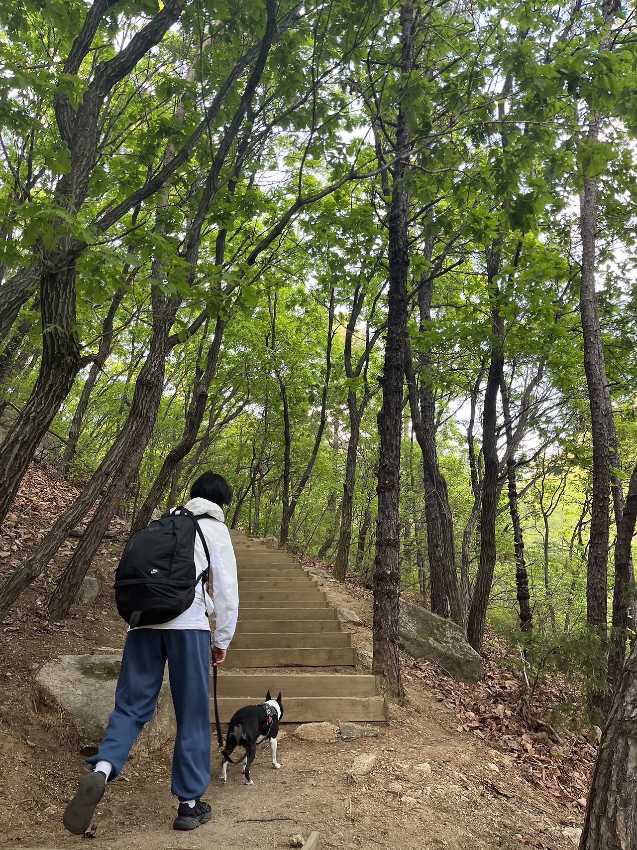 정상 같은 곳을 지나 또 내려가고 올라가고를 반복했다. 갑자기 나의 도가니가 아파오기 시작했다. 올라갈 때는 괜찮았는데 내려갈 때 너무 아팠다. 끝이 보일 기미가 보이지 않았다. 친구는 반복되는 여정을 살짝 질려하기 시작했다. 마치 한라산 하산길과 같이 똑같이 생긴 끝 없는 계단을 내려오는 기분을 또다시 느꼈다. 다온이는 우리의 걸음을 맞춰주었다. 먼저 올라가서 우리를 기다려줬다. (물론 줄은 계속 잡고 있었다.) 다온이도 반복되는 길에 살짝 멈칫 해 했다. 한참을 반복되는 계단을 쳐다보더니 다시 걷기 시작했다. 그런 다온이의 모습을 보고 ‘혹시 다온이도 지겨운 걸까..?’ 내 멋대로 생각하게 됐다.