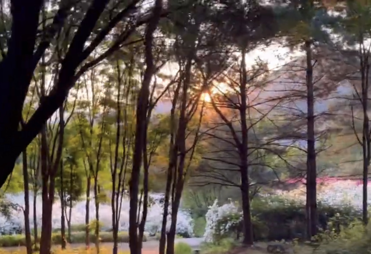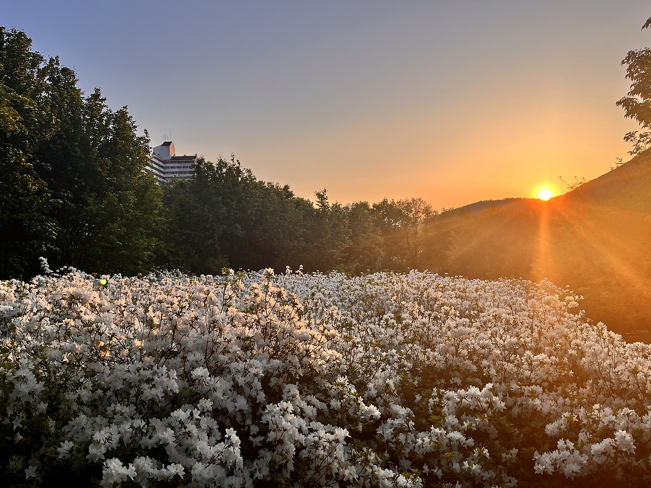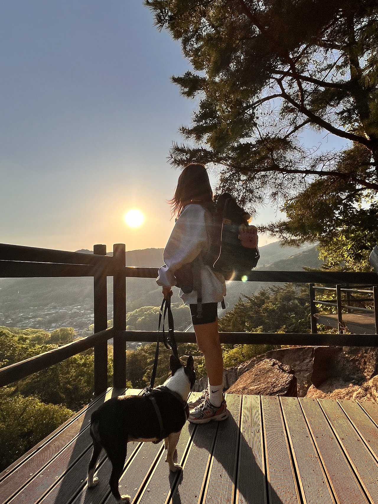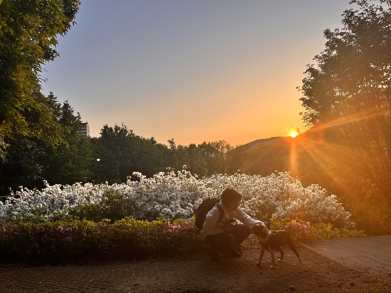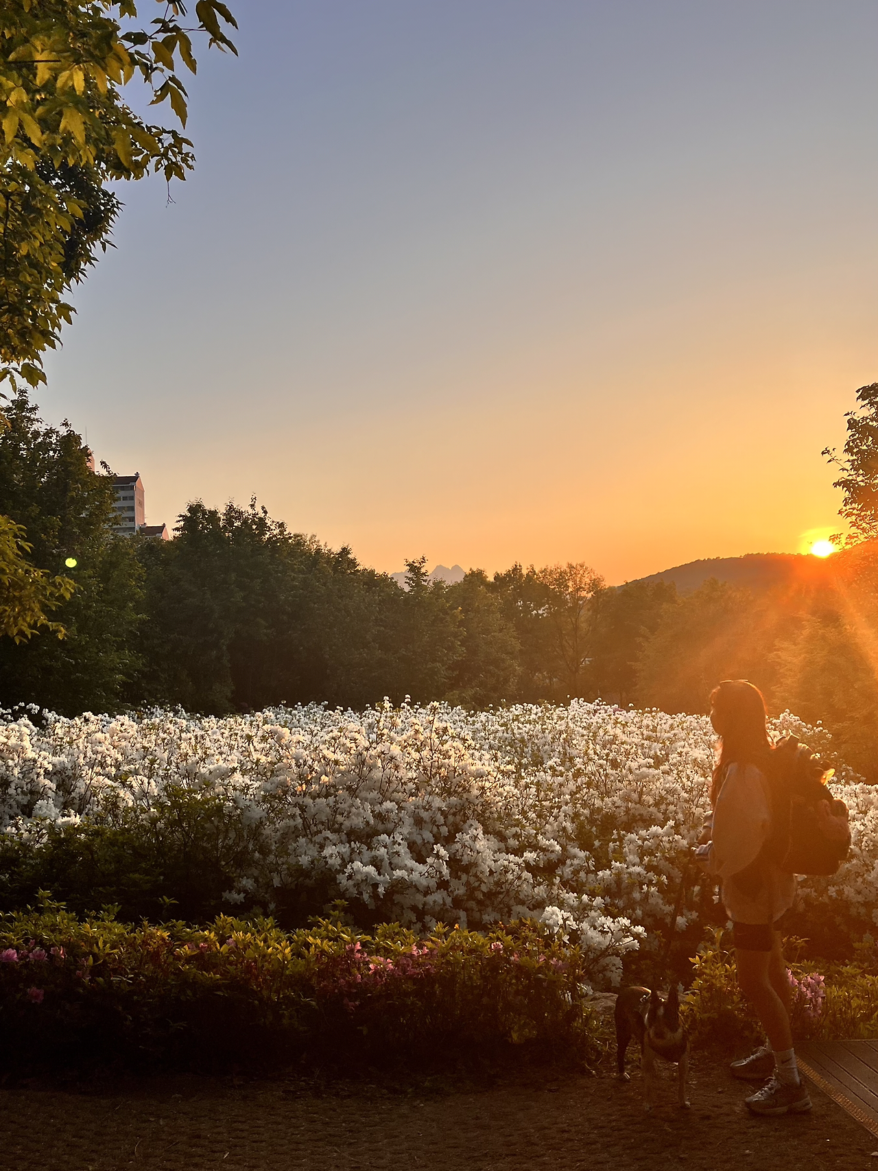 겨우겨우 해가 넘어갈 즈음에 철쭉동산에 도착할 수 있었다. 너덜거리는 나의 도가니를 붙잡고 겨우겨우 내려왔다. 친구도 다리가 아린다고 했다. 지치고 힘든 다리를 이끌고 철쭉동산에 다다른 순간 감탄을 금치 못했다. 철쭉 철이라서 철쭉이 만개했었고 타이밍 좋게 넘어가고 있는 해의 모습이 마치 그림같이 아름다웠다. 지치고 힘든 모든 감정들이 한순간에 마법처럼 사라져 버렸다. 사람이 아름다운 걸 보면 정신적으로 잠깐 마비가 되는 걸까? 너덜 거리는 다리의 통증이 갑자기 느껴지지 않고 미소가 절로 나왔다. 멋진 경치에서 다온이와 함께 사진을 남겼다.