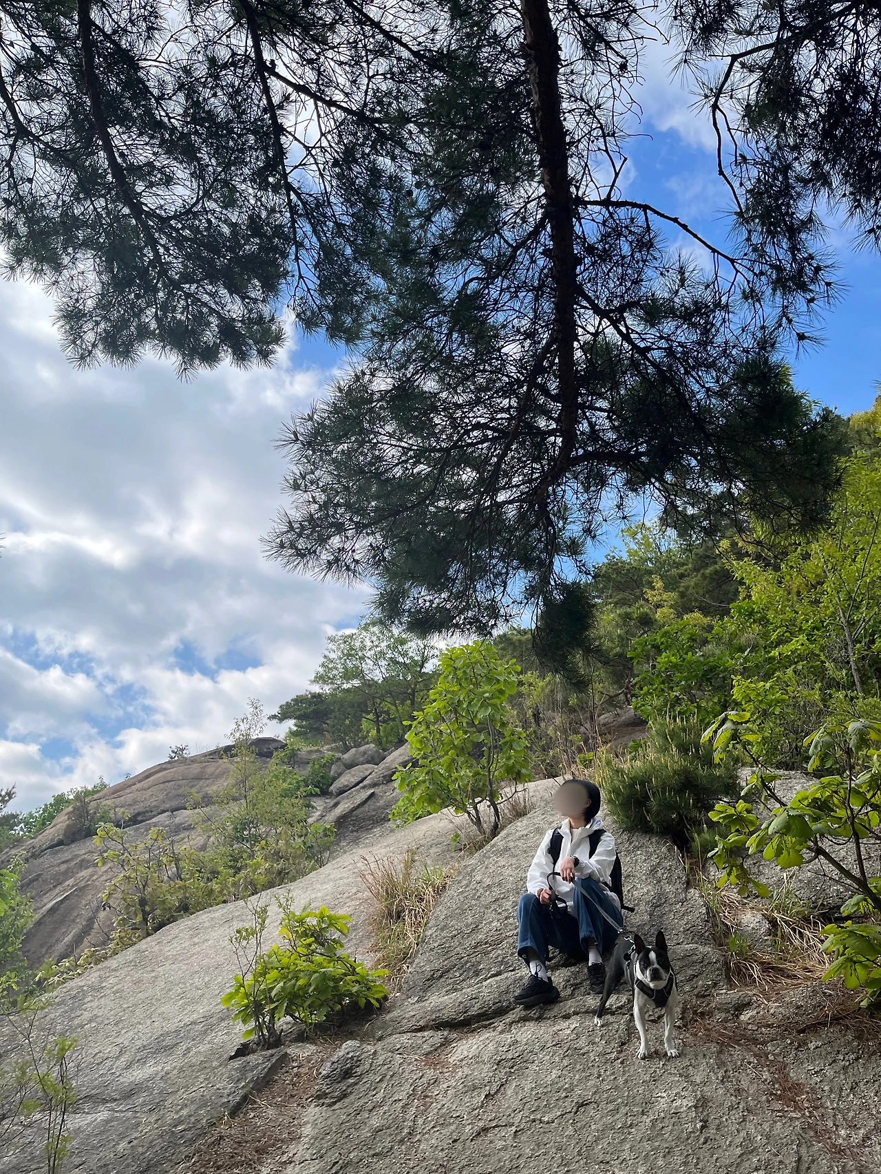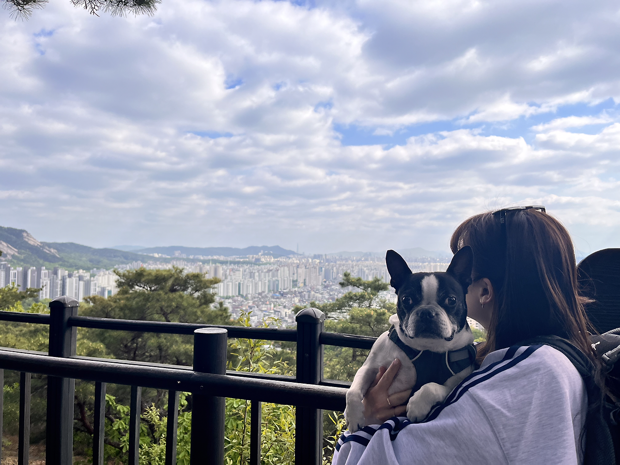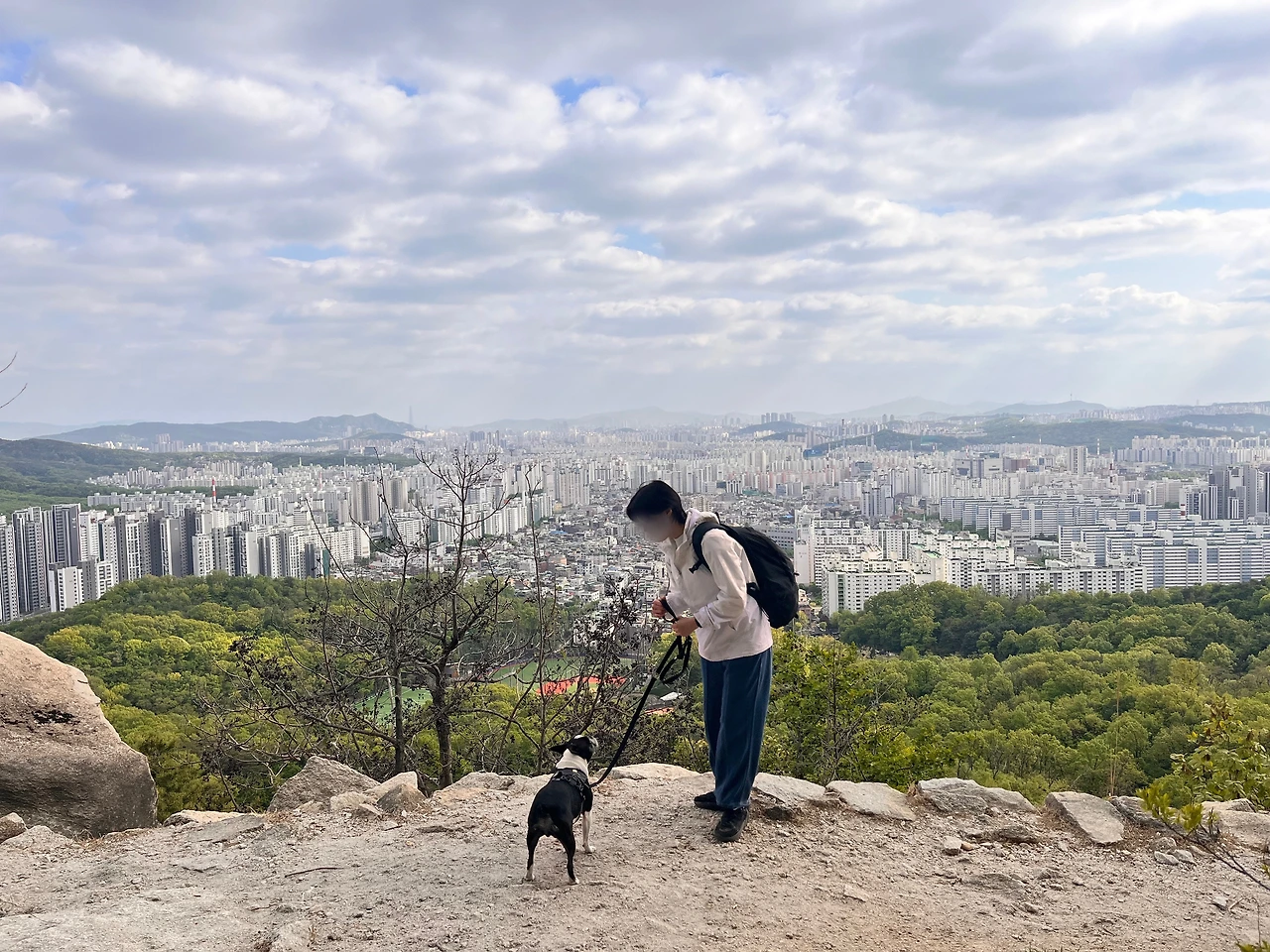 수락산을 오르고 올라 정상 비슷한 곳에 도착했다. 돌산이 뿜어내는 위엄에 우리는 입이 떡 벌어졌다. “둘레길 맞아? 이게 둘레길 맞냐고..” 옛날에 올랐던 북한산의 힘듦이 살짝 스쳐 지나갔다. 앞에 펼쳐진 경치를 감상했다. 다온이는 아직까지도 팔팔했다. 돌들을 넘나들며 신나게 왔다 갔다 하는 모습에 보잘것없는 나의 체력을 반성했다. 다온이와 같이 사진을 남기자며 사진타임을 가졌다. 다온이는 참을성 있게 사진타임에 응해주었다.