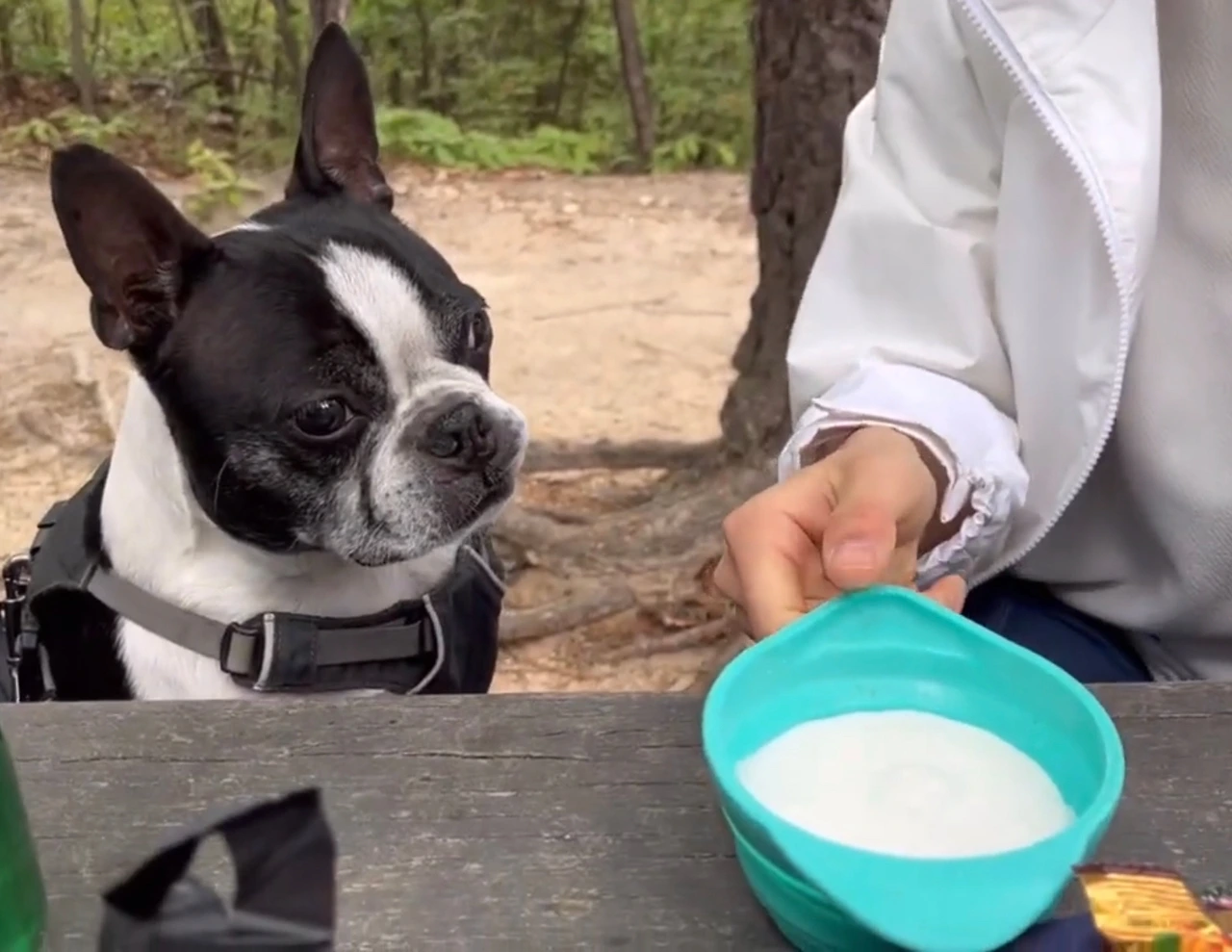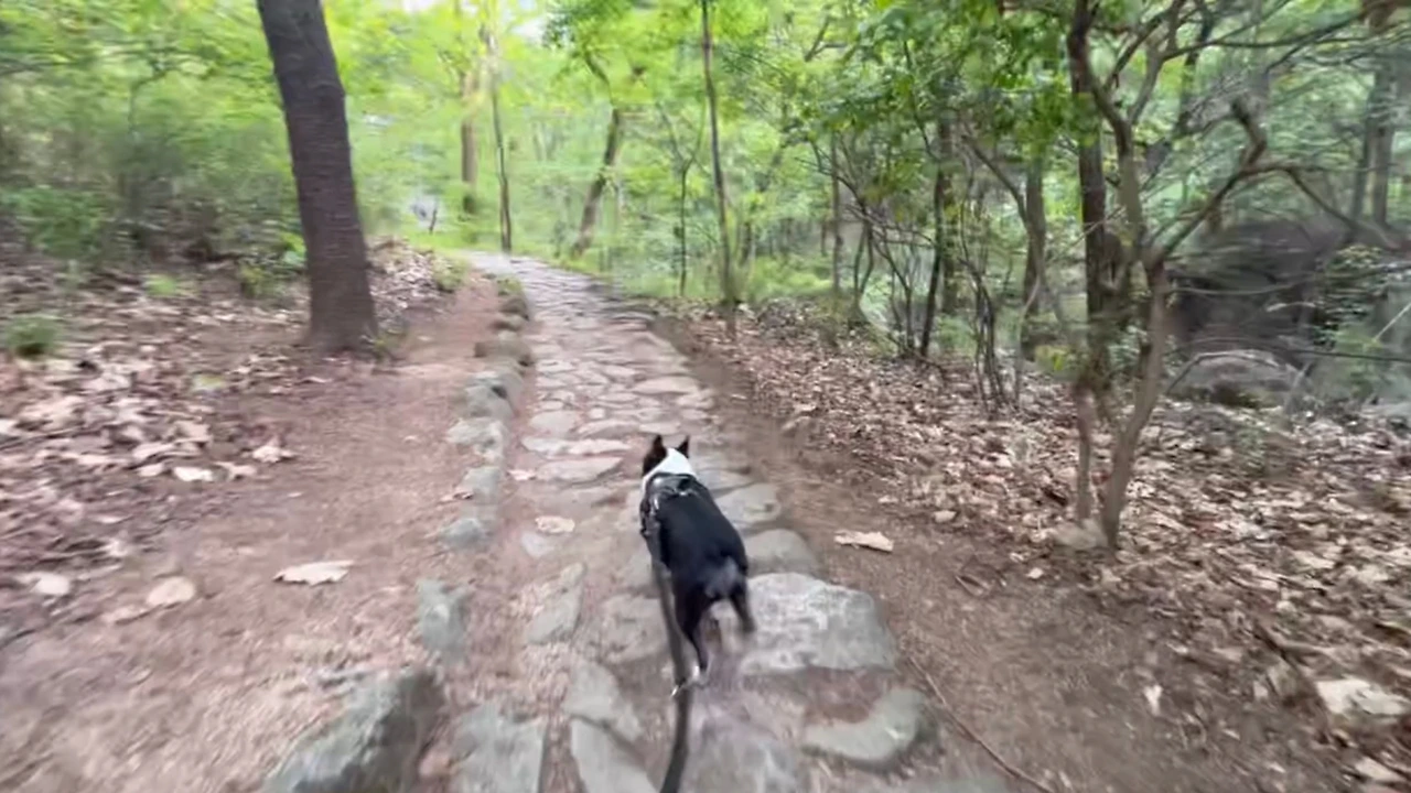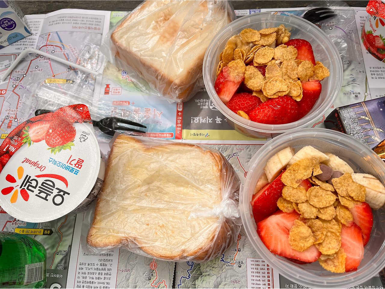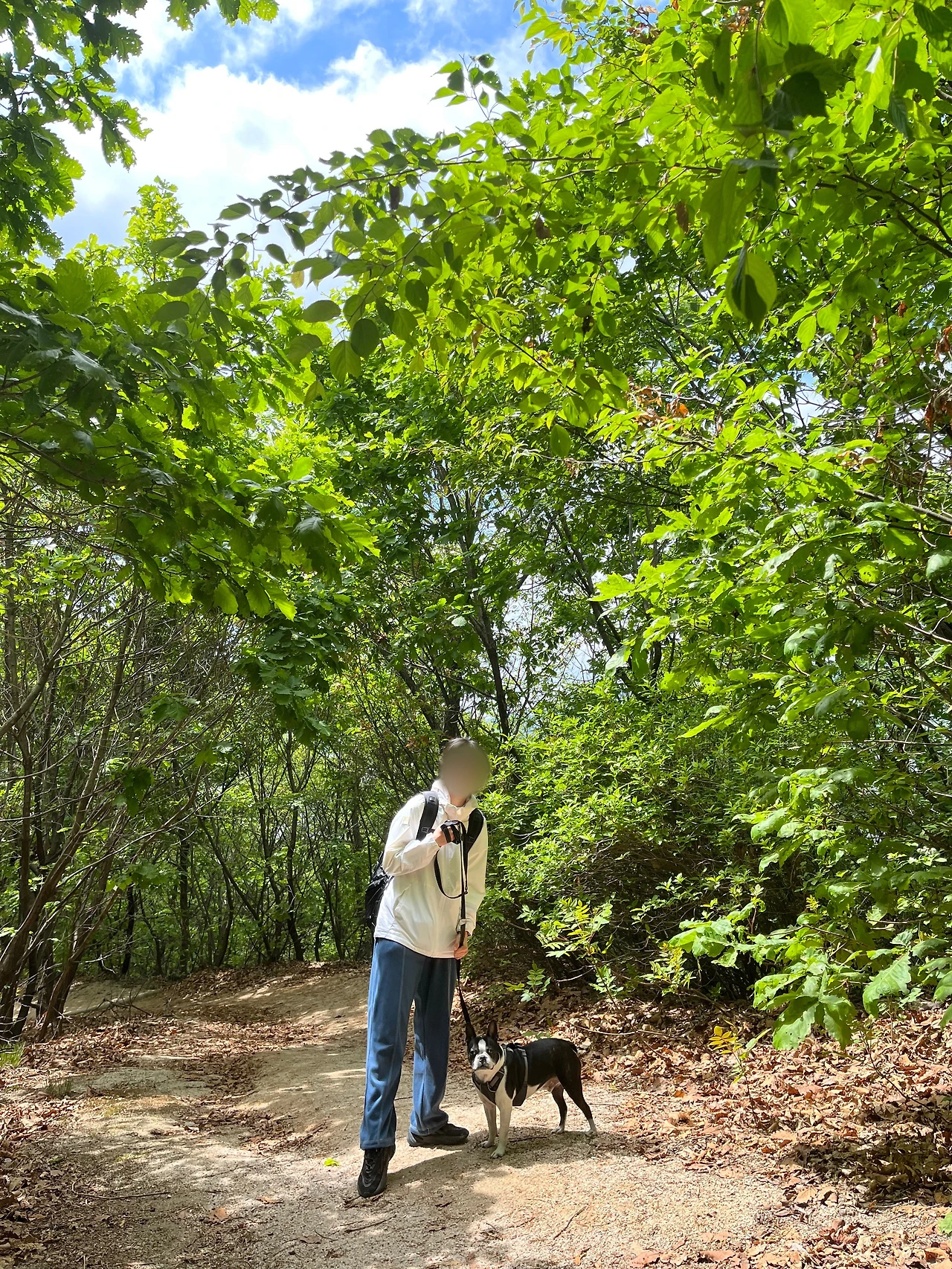 열심히 오르고 있는데 갑자기 허기가 찾아왔다. 우리는 급하게 싸 온 먹거리들을 풀었다. 나는 배고플 친구와 나를 위해 토스트와 과일 그리고 요거트를 챙겨 왔다. 우리는 야무지게 먹었고 다온이에게는 우유를 줬다. 다온이는 유제품 러버인데 유제품을 좋아하는 만큼 방귀냄새도 진하다. 약간 고소하게 진하고 독하다. 사람과 강아지 모두 다 즐거운 간식타임을 가진 뒤 쓰레기는 싹 챙겨 가방에 넣었다. 한데 먹거리를 챙겨 올 필요는 없었다. 중간중간에 편의점도 있고 작은 식당들도 많이 있었다. (물론 강아지와 함께 먹으려면 야외에서 먹어야 하겠지만.. 야외도 안 될 수도 있다..) 우리는 다시 산길을 오르기 시작했다.