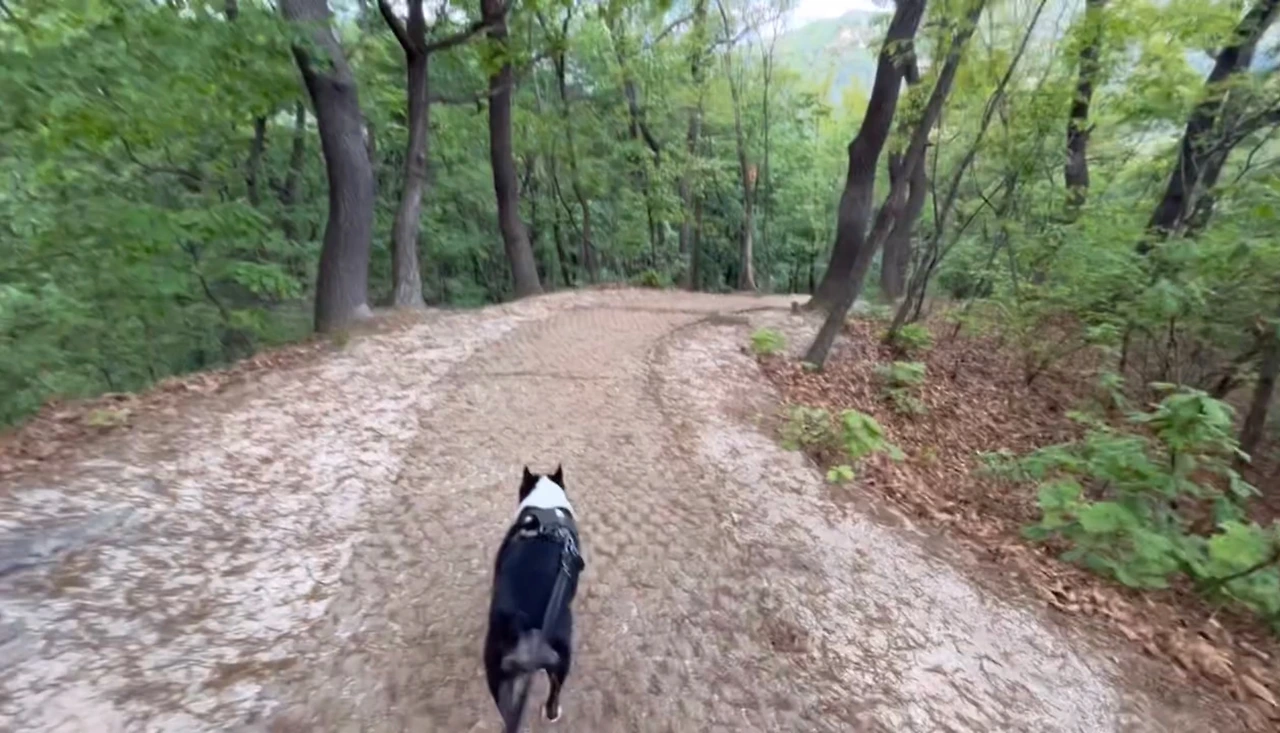 사실 둘레길이라고 해서 평지길이 많을 줄 알았는데 산이었다. 오르고 또 오르고 오르는 걸 반복해서 내 친구와 나는 굉장히 당황했다. 다온이는 두 개의 심장이란 별명에 딱 맞게 우리를 끌어올려줬다. 줄을 잡고 있던 나는 종이인형처럼 다온이에게 딸려 내려갔다가 올라갔다. 내가 말을 타고 있는 건가? 썰매를 타고 있는 건가? 싶었다. 다온이에게 끌려가면서 “다온아 나는 사람이야.. 다리가 두 개밖에 없단 말이야..”를 외쳤다. 하지만 다온이는 들리지 않는다.