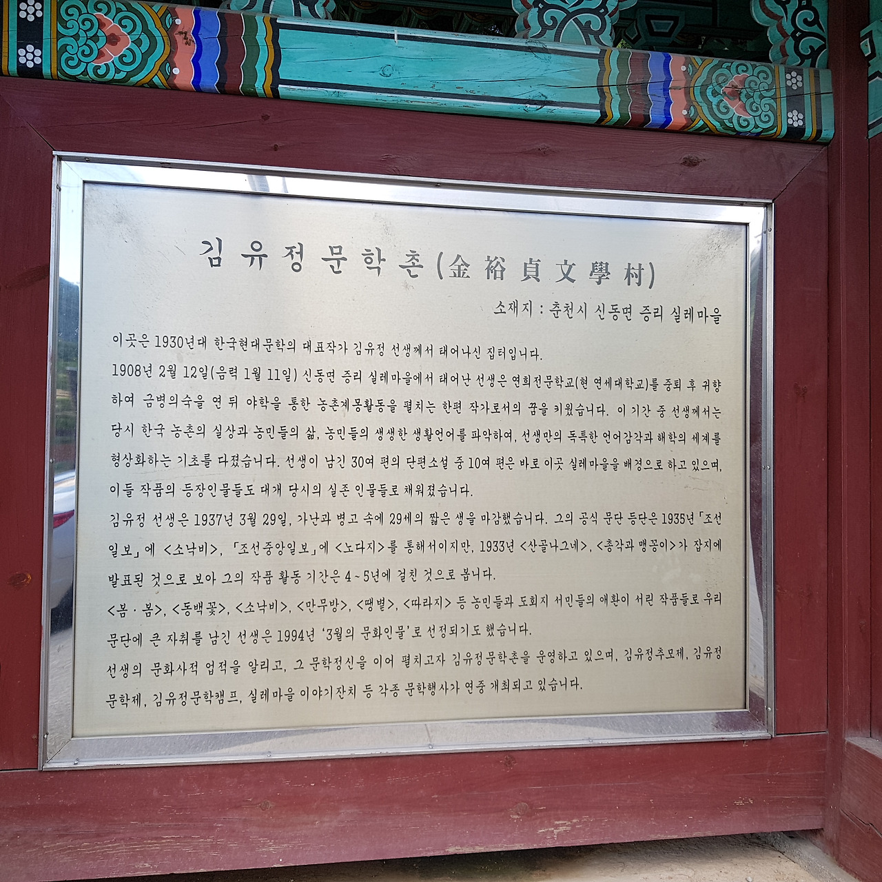 본 게시글 위에서 말한 것처럼 이 길을 따라 올라가다 보면 실레 이야기길을 중간중간에서 만난다. 올라가는 길이 김유정과함께 오르는 기분도 있으며 일부러 쉬지 않아도 그의 소설속 내용이 우리를 쉬게 만드는 곳이다. 김유정이 나를 쉬어가게 하는 길이다. 장면을 다 못찍은게 아쉬운 부분으로 남아 있다.