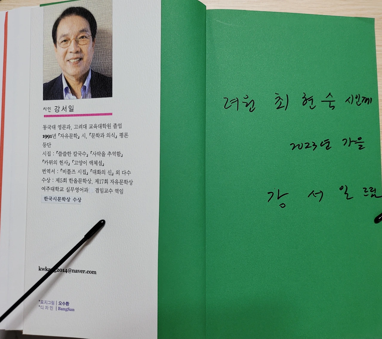협회에 계신 선생님과 갤러리 지키는 당번을 했다. 관람 손님을 맞으며 작품과 문학에 대한 이야기로 주말 시간을 보냈다. 글 쓰는 문인들의 문학 이야기는 가장 관심사 있는 부분이라 언제 어디서 누구와 만나도 끝없는 이야기가 펼쳐진다. 내게 주신다고 출간한 시집을 한 권 들고 나오셨다. 선생님의 시집은 번역서를 비롯해 이 외에도 여러 권의 책을 더 출간하셨다. 2023년 가을에 받은 첫 싸인의 목록이다.