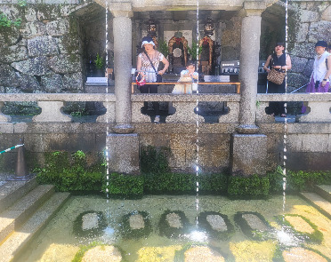 청수사 본당 아래로 내려가면 청수사의 기원이 된 샘물이 떨어지는 ‘오토와노타키’를 만날 수 있다. 이 폭포수 줄기는 세 갈래로 나누어져 아래로 떨어지는데 왼쪽부터 학업성취, 사랑과 결혼, 건강과 장수에 효험이 있다하여 이 물을 마시려는 사람들이 줄을 서있었다. 세가지 다 놓칠 수없는것들이 아닌가. 뭐든 빠지지않는게 우리 여행의 철칙이니 그 물을 마시려고 근 한 시간을 기다린거 같다. 반은 땡볕이라 쉬고 있다가 차례가 되면 오라고 아무리 말해도 사랑이는 끝까지 나하고 같이 줄을 섰다. 천진한 아이의 마음에 뒤늦게 들어오는게 새치기처럼 여겨져 마음이 편하지 않은 거 같았다. 남편은 한발 떨어져 서있었다. 사진을 찍어주기 위해서였다.
