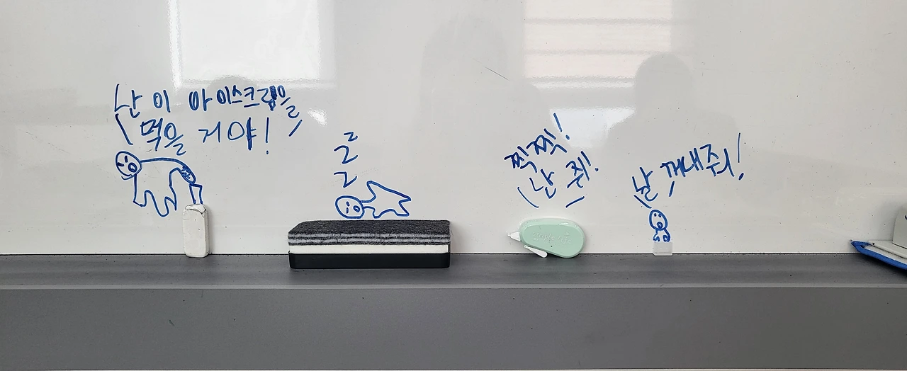 화이트보드에는 아이의 만화 속에서 보던 친근한 그 캐릭터들이 교실의 물건들과 콜라보가 되어 살아 있었다.(사실 아직은 캐릭터가 잘 구별이 안 되는 수준이다^^;)