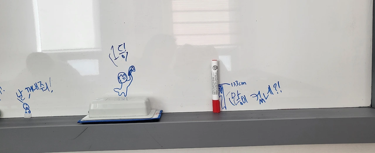 빨강 보드마카는 병원에서 측정했던 키와 몸무게를 재는 기구로 변신하여