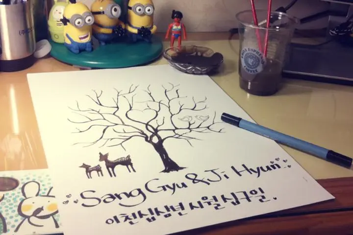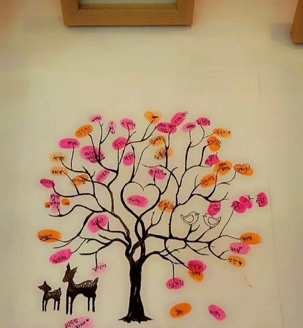 직접 그린 웨딩 트리 그림으로 결혼식에 참석한 지인들의 손도장을 남겨주었다.