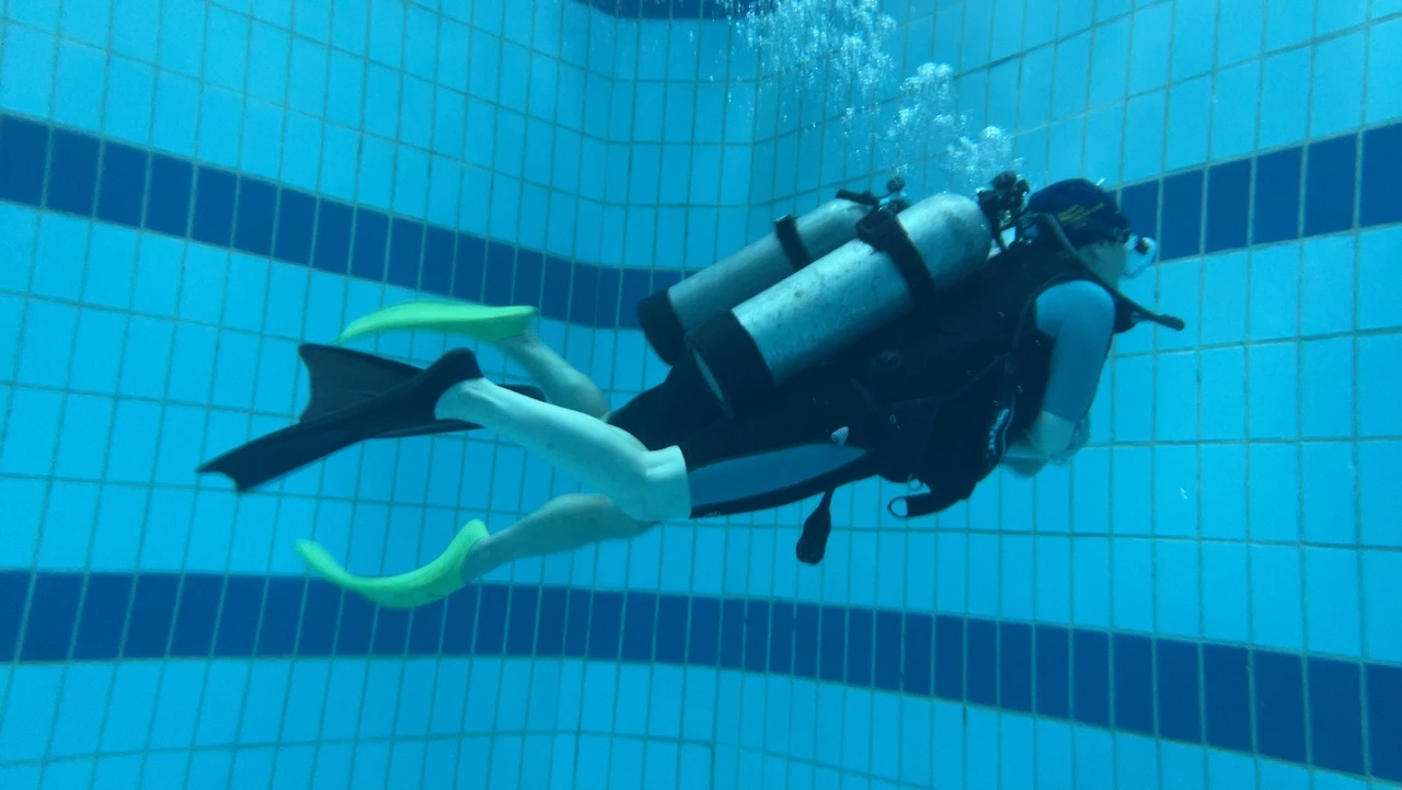 늘 발이 닿는 수영장에서 자유형을 하다가 생소한 장비를 장착하고 6m 수심의 풀로 들어간 것이다.