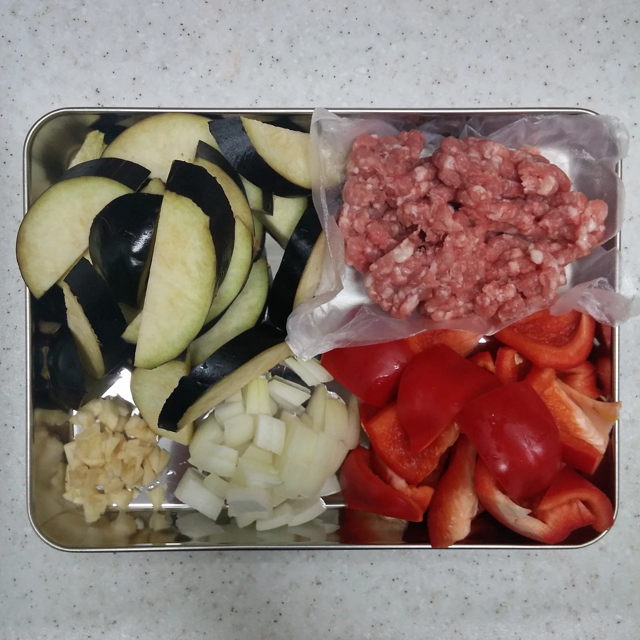(1인분 기준) 가지 하나, 파프리카 하나, 양파 반 개, 냉장고에 남은 파 한뿌리(생략 가능), 마늘 한 톨, 다진 돼지고기 100g~150g