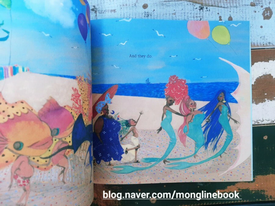 할머니는 Julian의 손을 잡고 인어들이 가득한 곳으로 갑니다. 그곳에는 많은 인어들이 있어요. Julian과 할머니도 이들과 함께 어울리며 행진을 합니다.