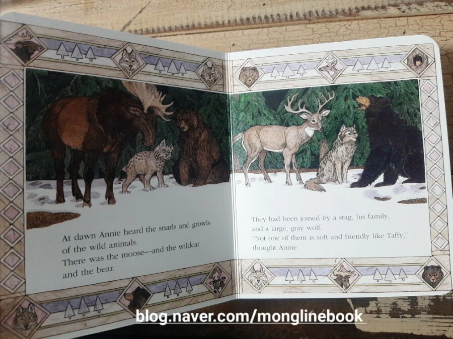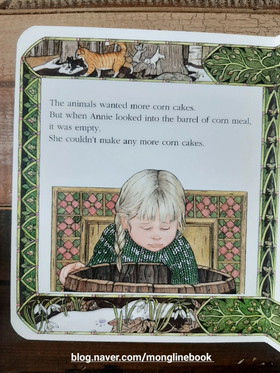 애니는 길들일 수 있는 작은 동물을 원하지만 큰 동물들이 이 겨울에 배가 고프다는 것을 누구보다도 잘 알고 있고 느끼고 있습니다. 나중에는 통에 있는 옥수수를 탈탈 털어 빵을 만들어 썰매로 끌고 와서, 동물들이 먹을 수 있도록 수북이 놓아두기까지 합니다. 그리고 애니의 그 따뜻한 마음을 추운 겨울이 알아채기라도 한 듯이 그곳의 눈들이 녹으면서 초록 새싹이 돋아나는 모습도 볼 수 있습니다.