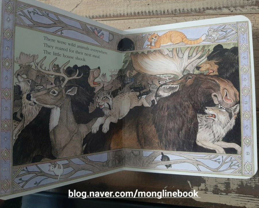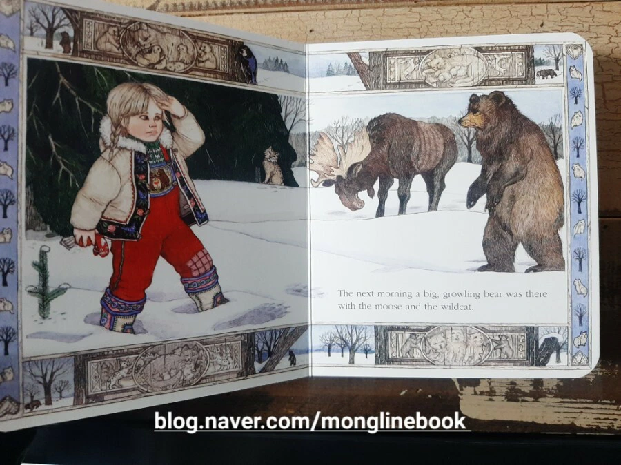 다음 날 아침에는 무스와 살쾡이가 빵이 있던 곳에 있습니다. 살쾡이는 길들이기에 너무 예민하지요. 그래서 애니는 옥수수빵을 더 갖다 놓습니다.