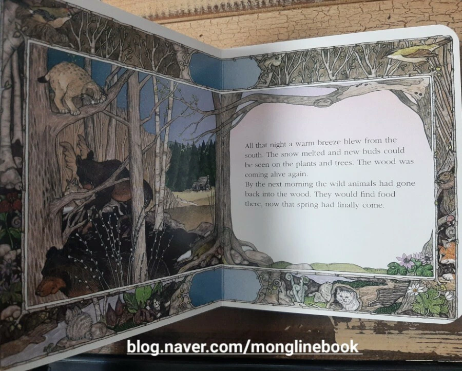 그날 밤, 따스한 바람이 남쪽에서 불어옵니다. 눈이 녹기 시작했어요. 숲에 다시 생기가 돌기 시작합니다. 모든 동물들은 다시 숲 속으로 돌아갑니다. 마침내 숲에서 음식을 찾을 수 있는 봄이 왔습니다.