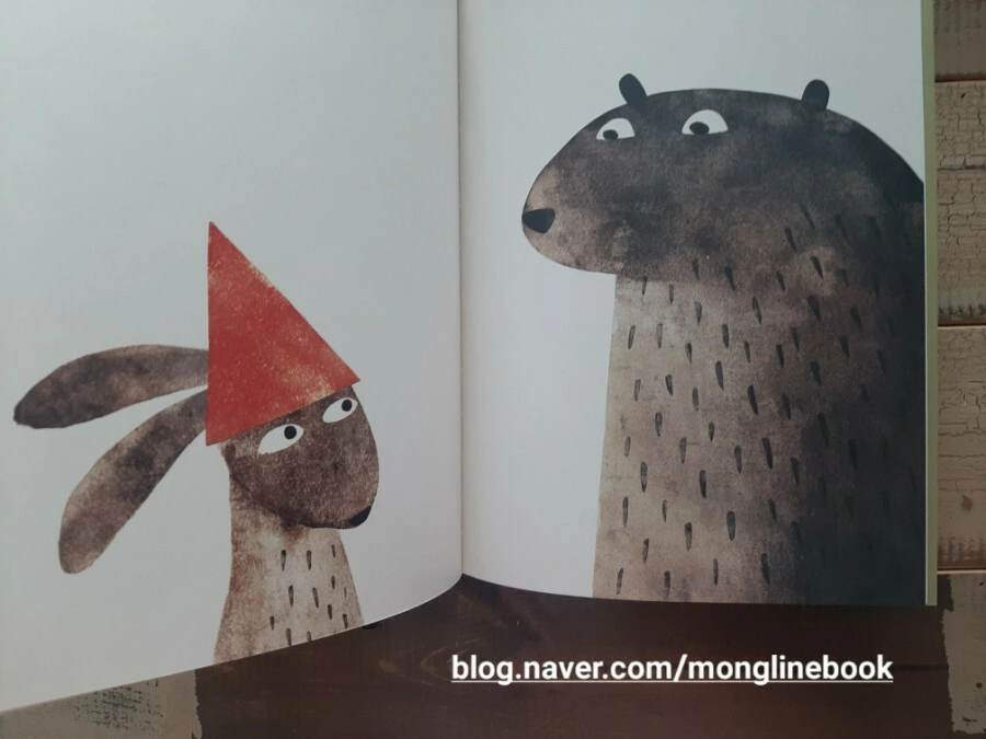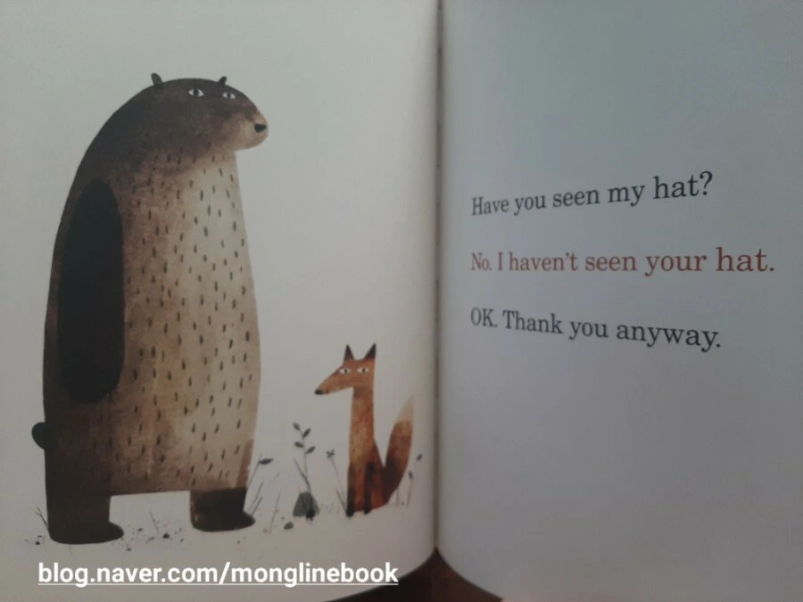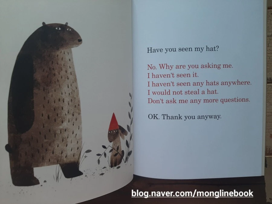 "내 모자는 빨간색이고 끝이 뾰족해...."라고 말하던 곰은 갑자기 무언가가 떠오릅니다. 그래서 사슴과 뱀과 여우와 거북이를 지나서, 어디론가 달려갑니다.