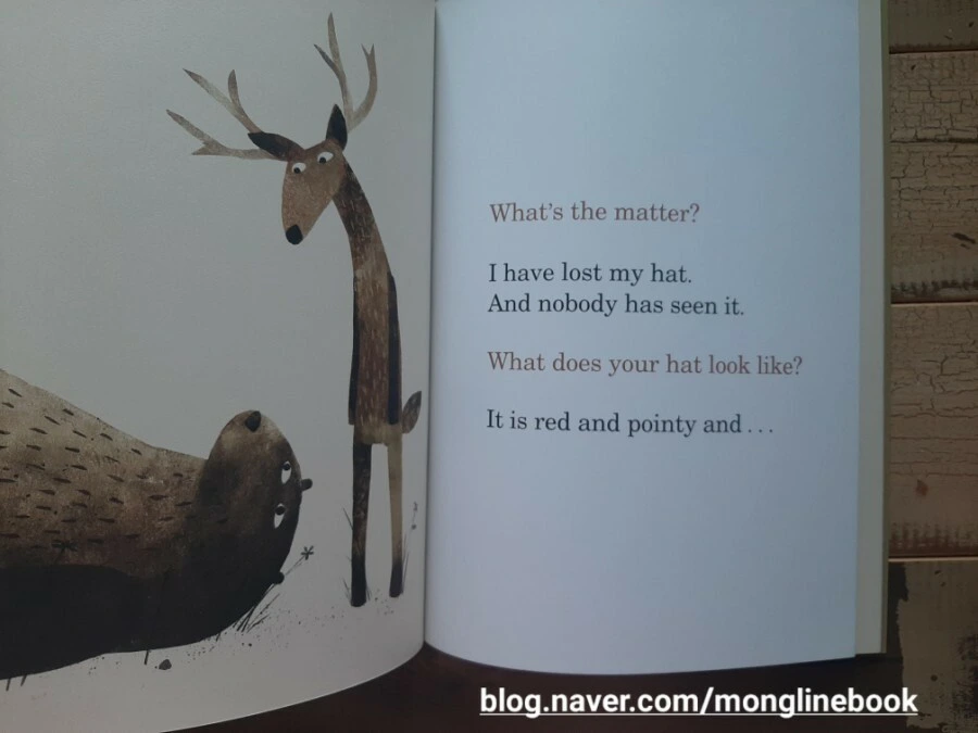 그때 사슴이 와서 물어봐요. 무슨 일이냐고, 모자가 어떻게 생겼냐고.