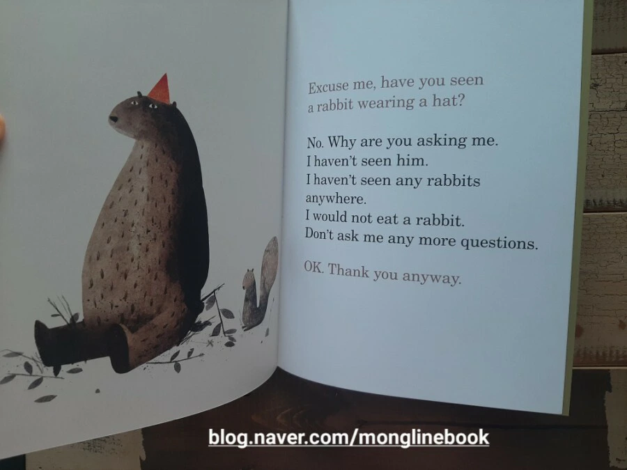 'I WANT MY HAT BACK'을 읽으면서 문득 그때의 사건이 떠올랐습니다. 그래서 곰이 얼마나 고민하며 모자를 찾아다녔을까 안타까웠습니다. 하지만 토끼의 빠르고 긴 대답과 맨 뒤에 나오는 곰의 빠르고 긴 대답을 소리 내어 읽으면서 빵 하고 웃음을 터트리지 않을 수 없었어요. 우리가 잘못을 하고 거짓말을 할 때 보통은 말의 속도가 빨라지지 않나요? 괜히 더 화를 내기도 하고요. '도둑이 제 발 저리다'라는 속담에 딱 어울리는 토끼와 곰입니다. 토끼에게 어떤 일이 벌어졌는지 우리가 확실히 알 수는 없지만 앞으로는 거짓말을 하지 않고 서로 믿으면서 좋은 우정을 유지해 나갈 수 있는 숲 속 동물 친구들이 되었으면 하는 바람입니다.