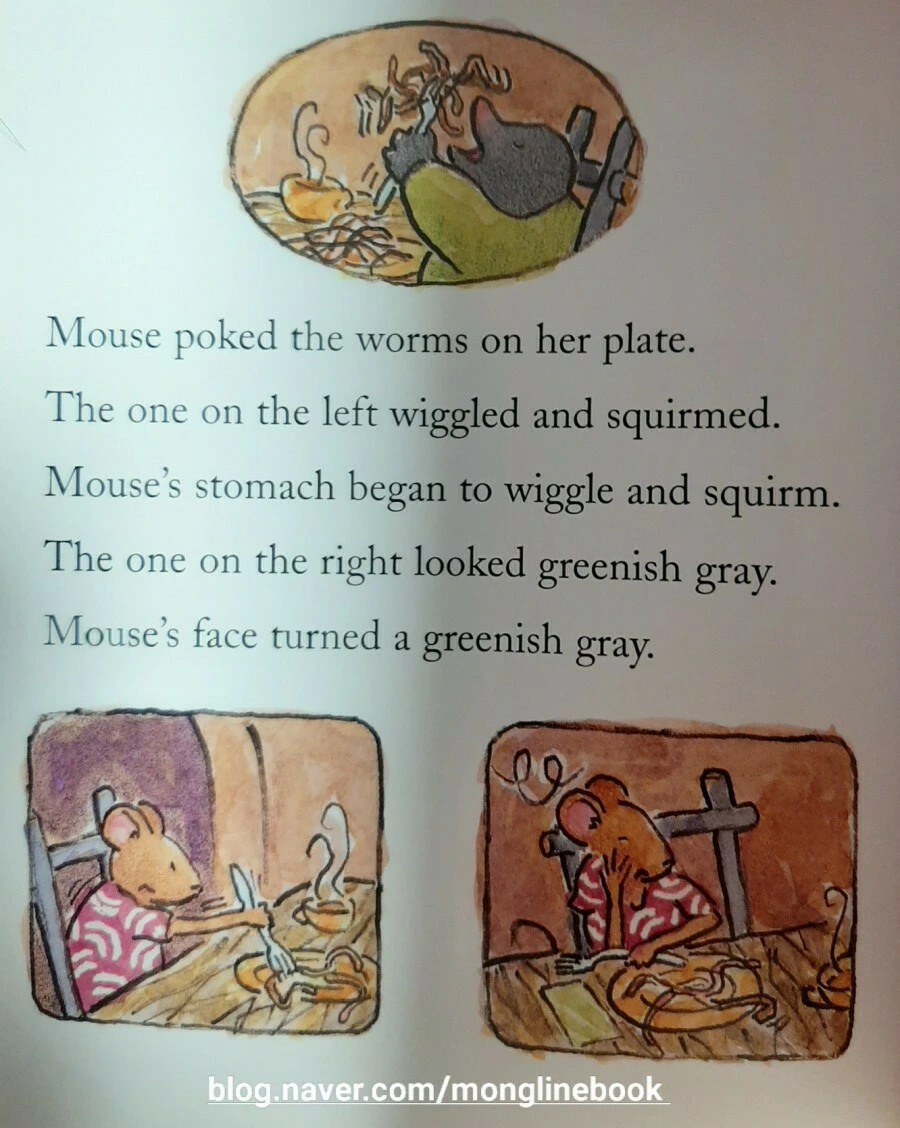 두더지는 배가 고파서 허겁지겁 먹습니다. 하지만 생쥐는 속이 거북해서 도무지 먹을 수가 없네요. 기침까지 한 생쥐는 조금 쉬어야겠다며 집으로 돌아갔습니다.