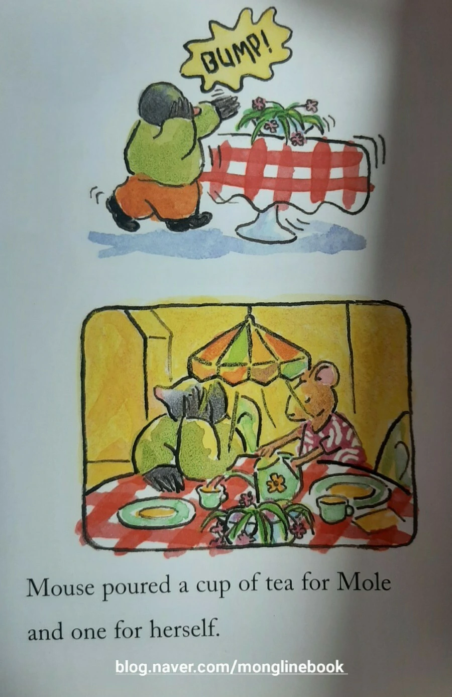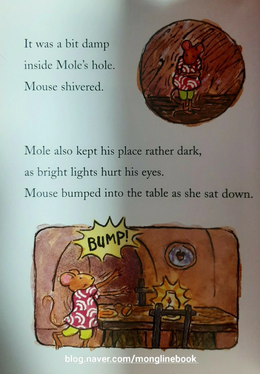 생쥐에게 두더지의 집은 약간 눅눅하고 좀 춥습니다. 그리고 어두워서 식탁에 부딪히고 말았습니다.