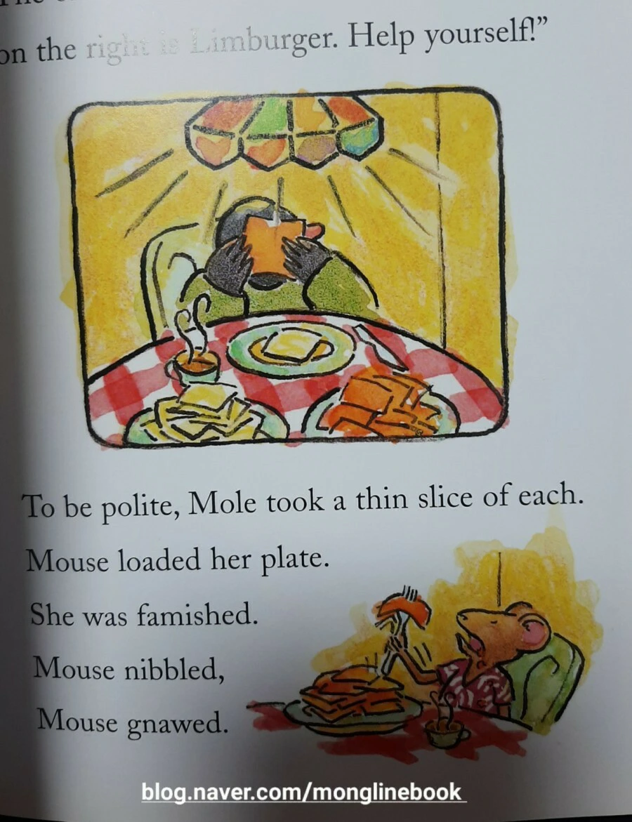 생쥐는 두더지가 어떤 치즈를 선호하는지 몰라서 두 가지 종류를 준비했다고 합니다. 오른쪽은 Limburger, 왼쪽은 cheddar이니 마음껏 먹으라고 이야기합니다.