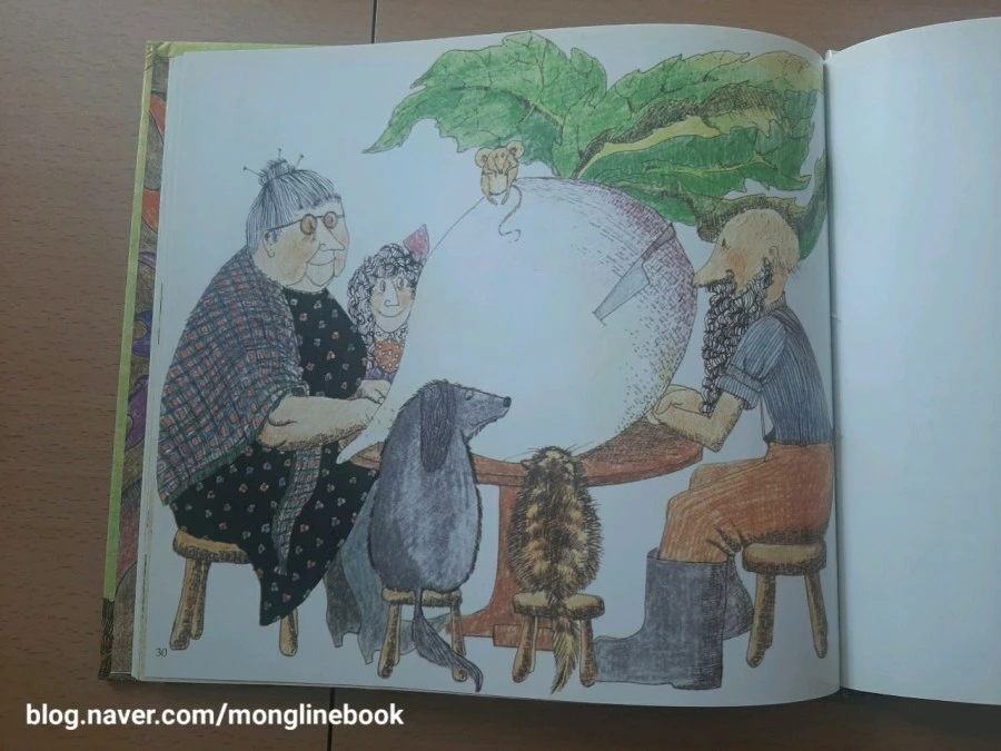 이 책을 읽을 때, 어른들은 늘 맨 뒤의 내용을 보며, '그래서?'라고 묻습니다. 여기에는 '뽑힌 순무로 무엇 무엇을 했습니다.'라는 내용이 나와있지 않거든요. 오픈 결말입니다. 상상력을 펼쳐야 하지요. 하지만 어른들은 그걸 못 견뎌합니다. '책이 이렇게 끝나도 되는 거야?' '미완성 아니야?'라는 이야기를 많이들 합니다.