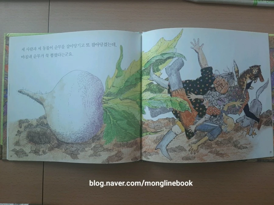 할아버지는 할머니를 불러서 당기고 또 당겼는데도 순무는 뽑히지 않았어요. 할머니는 나무에서 책을 읽고 있던 손녀를, 손녀는 소파에 앉아서 쉬고 있는 검둥개를, 검둥개를 꽃 속에 숨어 있는 고양이를, 고양이는 굴속에 들어가 있는 쥐를 불렀습니다.