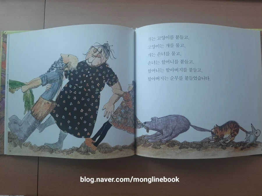 쥐는 고양이를, 고양이는 개를, 개는 손녀를, 손녀는 할머니를, 할머니는 할아버지를, 할아버지는 순무를 붙들고 잡아당기고 또 당겼는데 마침내 순무가 쑥 뽑혔습니다!!