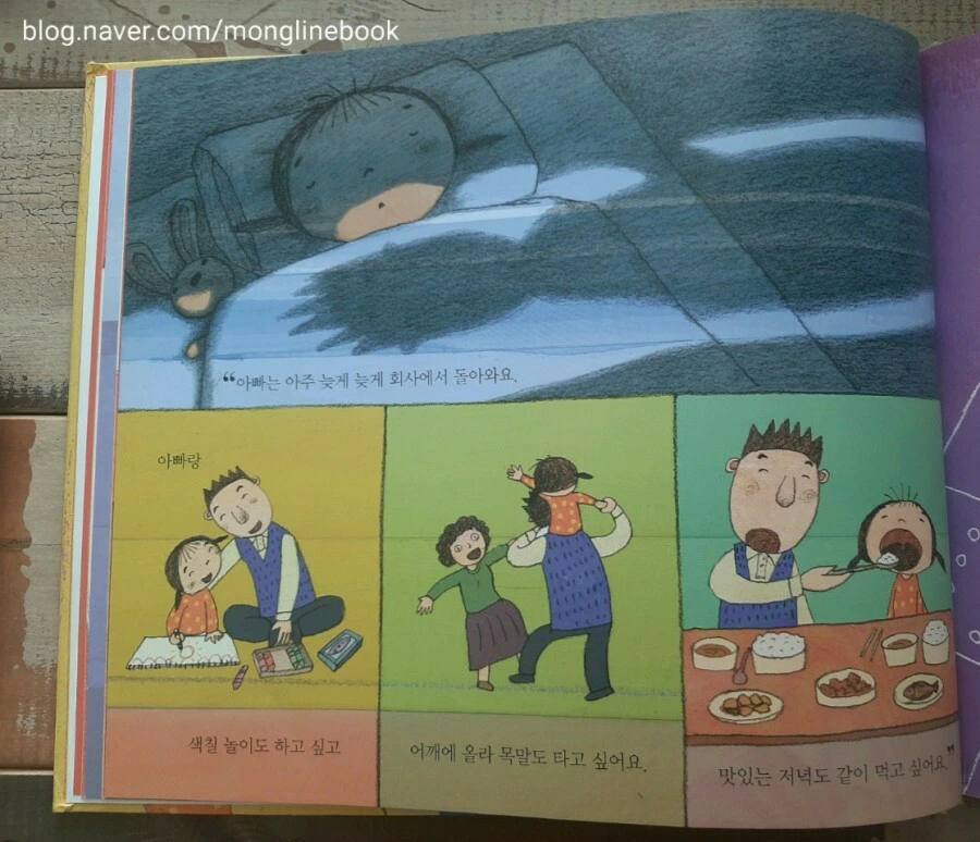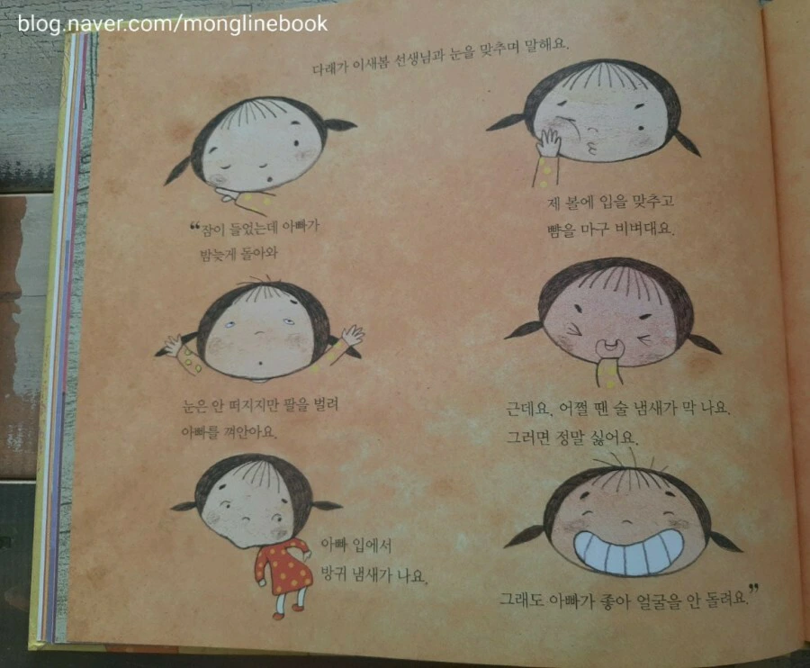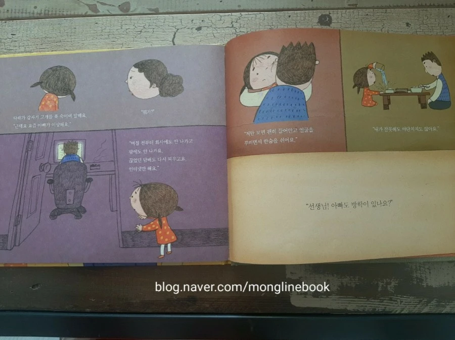 가족 각자가 자신이 해야 할 일에만 치우쳐서 밥 한 끼 조차 제대로 먹지 못하는 가정이 많이 있다고 합니다. 그래서 누가 어떤 고민을 가지고 있는지 어떤 일이 있는지 잘 알아보지 못하는 경우도 많이 있지요. "아빠는 나쁜 녀석이야." 이 책에서 다래는 아빠의 변화를 누구보다도 감지를 잘합니다. 아빠에게 관심이 많았고 아빠와 함께 하고 싶었기 때문이지요. 다래가 아빠에게 관심이 없었다면 그냥 그러려니 하며 마음이 아프지도 않았을 것 같습니다.