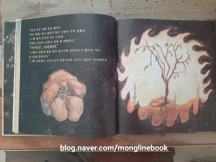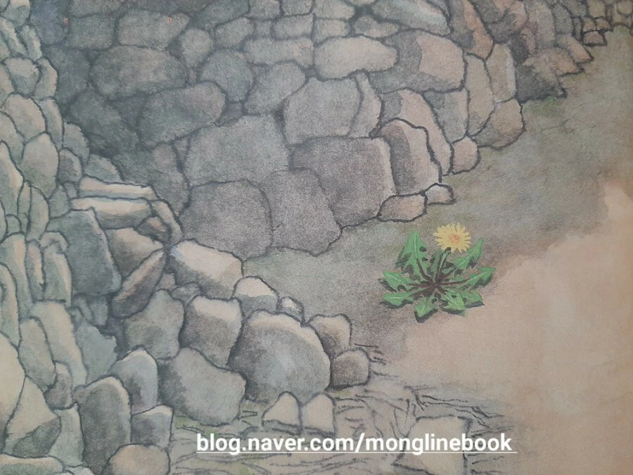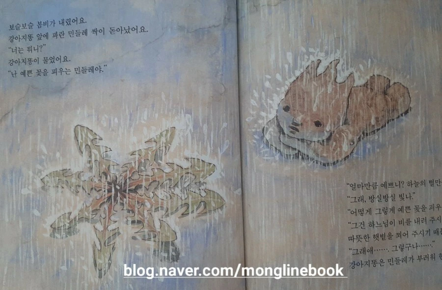 그리고 민들레 싹은 강아지똥에게 네가 거름이 되어 주어야 된다고, 네 몸뚱이를 고스란히 녹여 내 몸속으로 들어와야 고운 꽃이 핀다고 이야기합니다.