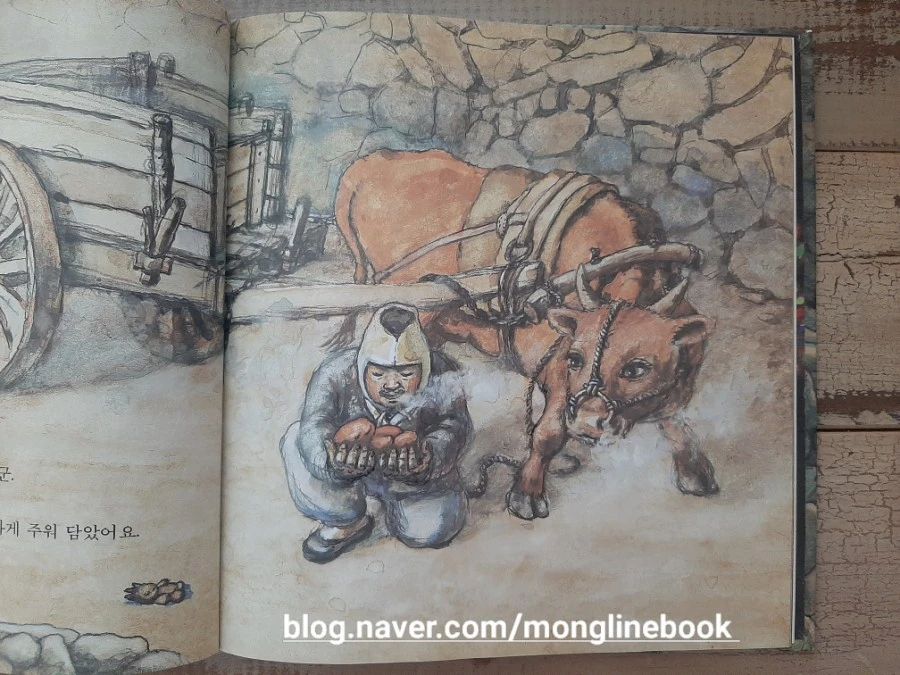 흙덩이가 괴로워하며 이젠 끝이라는 생각을 하고 있을 때 저쪽에서 소달구지가 다가옵니다. 소달구지 아저씨는 본인 밭의 흙이 떨어져 있는 것을 발견하지요. 도로 밭에 갖다 놓으려고 흙덩이를 소중히 주워 담습니다.