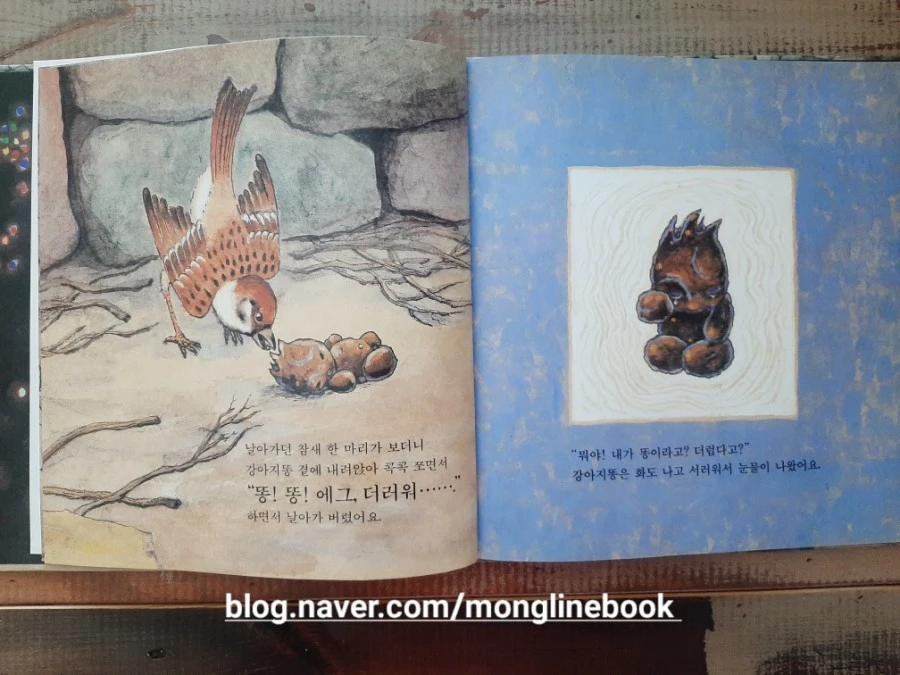 날아가던 참새 한 마리도, 흙덩이도 강아지똥이 더럽다고 합니다. 강아지똥은 화가 나고 서러워서 울음을 터뜨려 버렸습니다.