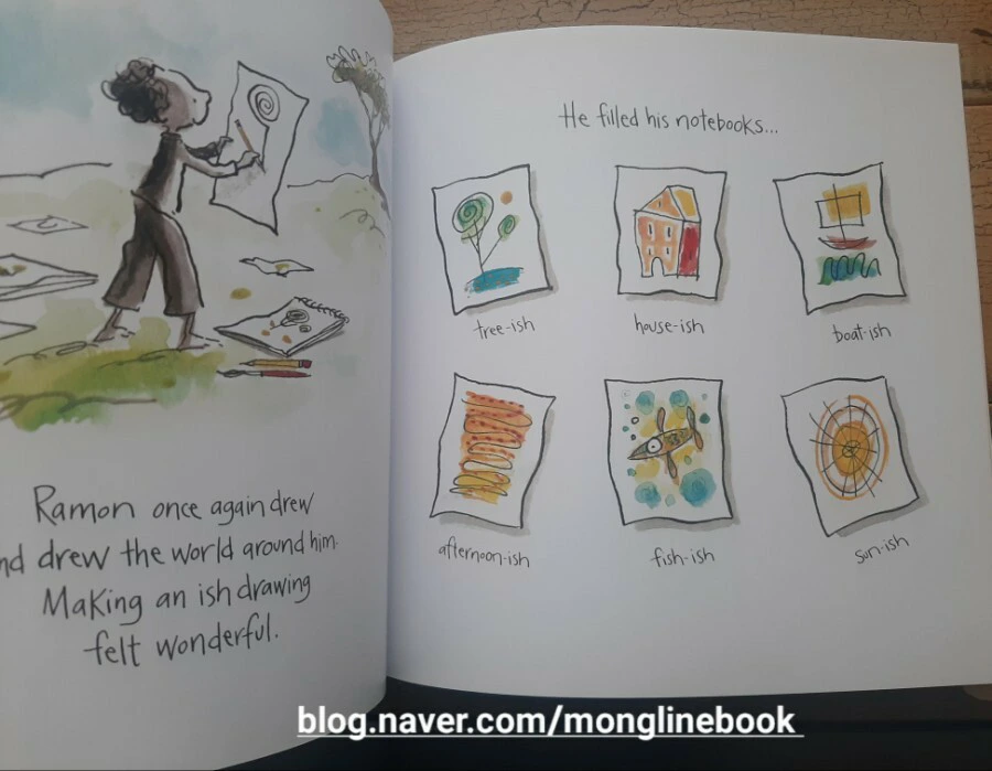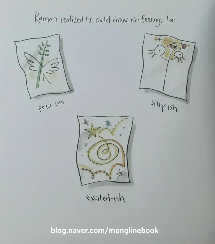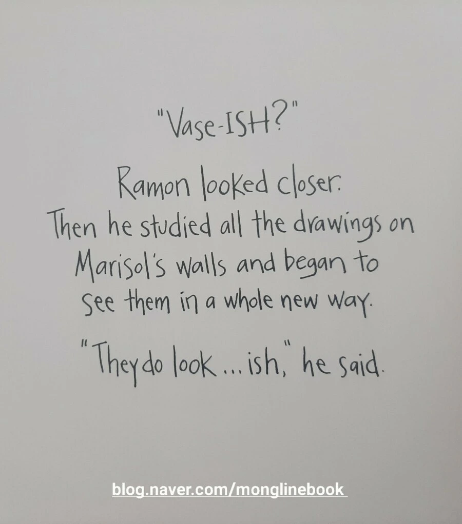 Ramon은 꽃병을 그린 거지만 전혀 꽃병과 똑같지 않다고 고집을 피웁니다. 하지만 Marisol은 "well, it looks vase-ISH!" "왜, 꽃병의 느낌이 나잖아! 닮았어!"라고 얘기를 해 줍니다.