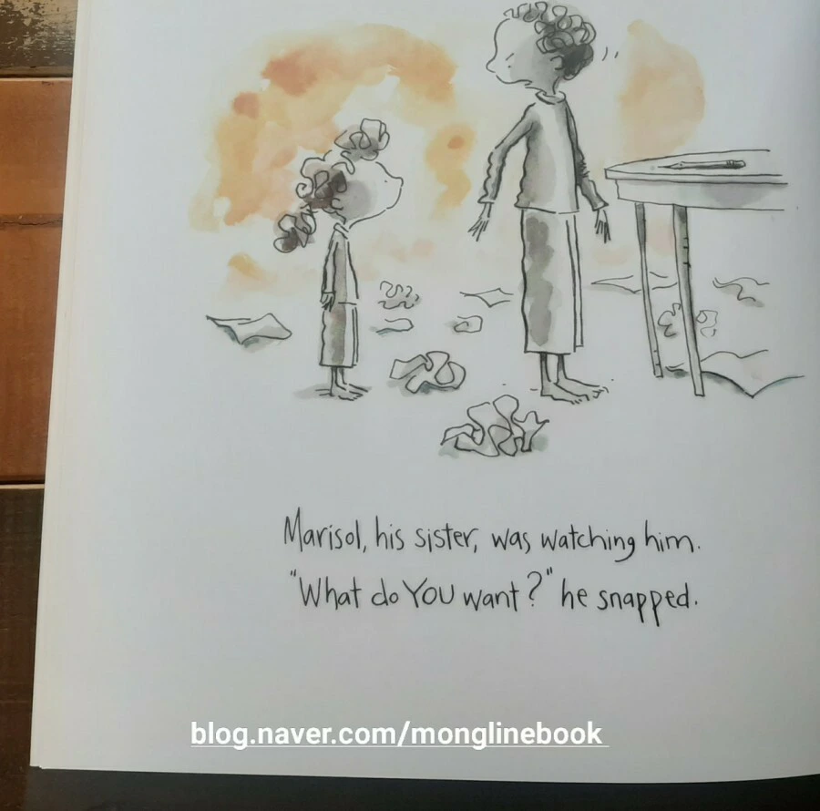 여동생 Marisol은 그림을 그리고 자꾸 그 그림을 꾸겨버리는 Ramon을 바라보고 있습니다. Ramon이 이제 더 이상 그림을 그리지 않을 거라고 화를 내며 저리 비키라고 하니까, 구겨진 그림을 얼른 주워가지고 방으로 도망을 갑니다.