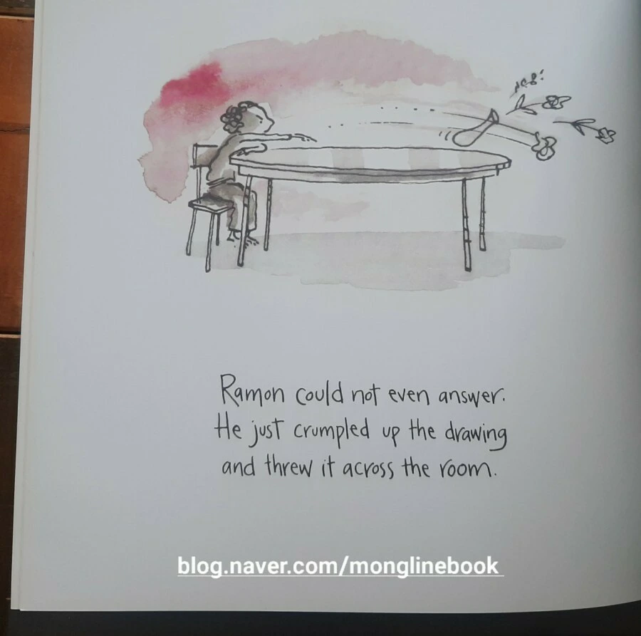 Ramon은 사물과 똑같아 보이도록 그림을 그리려고 노력을 하지만 그렇게 그려지지가 않습니다. 몇 달 동안 수많은 종이를 꾸겨버리면서 연습을 했지만 잘 되지 않습니다. 마침내 Ramon은 펜을 내려놓습니다.