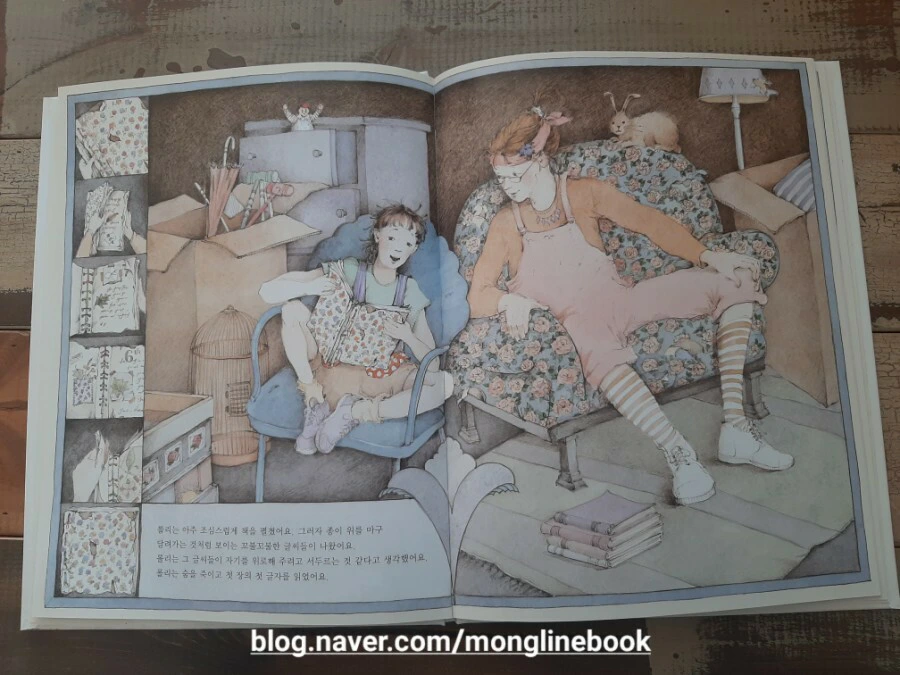 제인 이모는 다락방으로 롤리를 데리고 갑니다. 그곳에는 아주 먼 곳까지 여행을 했던 커다랗고 낡은 상자가 있습니다. 그리고 그 안에 <슬픔을 치료해 주는 비밀 책> 이 들어있었어요!