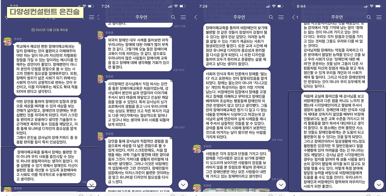 다시 한번 의무로 듣는 장애공감교육이 아닌 과목 특강으로 귀한 시간과 마음을 내어 주신 광남고등학교 주우연 선생님께 진심 어린 감사의 마음을 전하고 싶다.