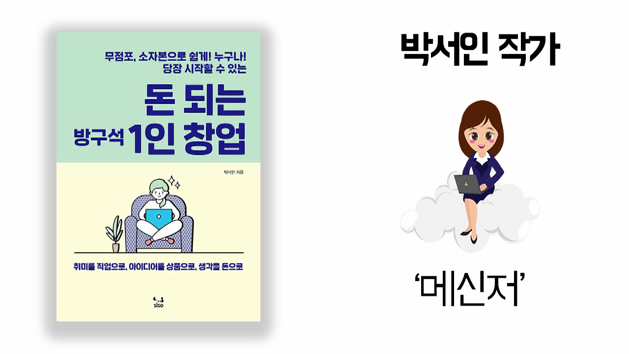 이것이 바로 ‘메신저의 역할’입니다. <돈 되는 방구석 1인 창업> 박서인 작가는 책 제목처럼 방구석에서 메신저로 활약하고 있습니다.