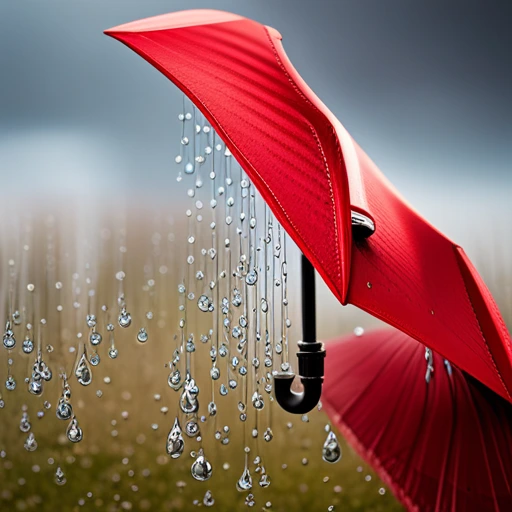 접혀있는 빨간 우산이 비에 젖어 물이 뚝뚝 떨어지는 모습을 그려줘